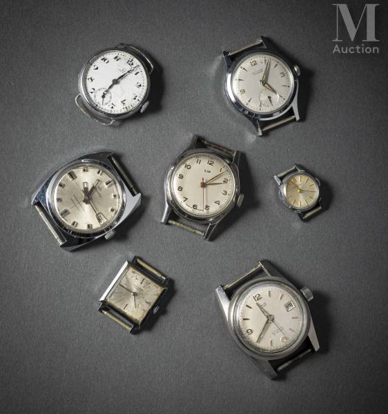 Lot de sept montres en acier et chromé, dont une OMEGA, une LIP, une UNIC, un Jean PERRET, une ZODIAC, une GUILLARD LAUSANNE, et une CONTINENTAL. Boîtiers ronds pour cinq, carré pour une tonneau pour l'autre. Fonds champagne, index chiffres arabes et bâtons, guichet date pour deux, cadran des secondes à 6h pour deux. Mouvements mécaniques. Fonds clippés et vissés.
