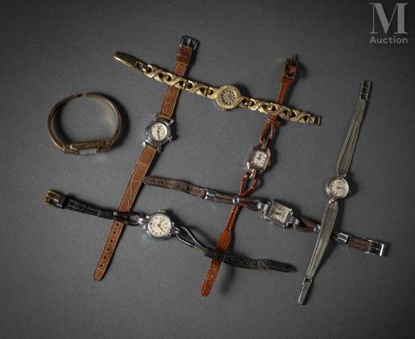 Lot de sept montres de dame en plaqué or et acier de marques diverses. Boîtiers de formes, dont une montre baguette. Cadrans fonds champagne, index chiffres arabes et bâtons. Mouvements mécaniques à remontage manuel. Bracelets divers.