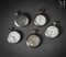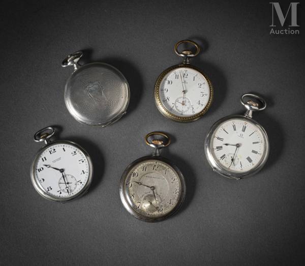 Lot de cinq montres de poche en argent (800 millièmes), métal et acier, dont OMEGA, LONGINES et LIP. Cadrans fonds blancs pour quatre et argenté guilloché pour l'une, index chiffres arabes, romains et chemins de fer, cadran des secondes à 6h. Boîtier niellé pour une Omega avec au revers un ravissant dragon surmontant un serpent. Mouvements mécaniques à remontage manuel.