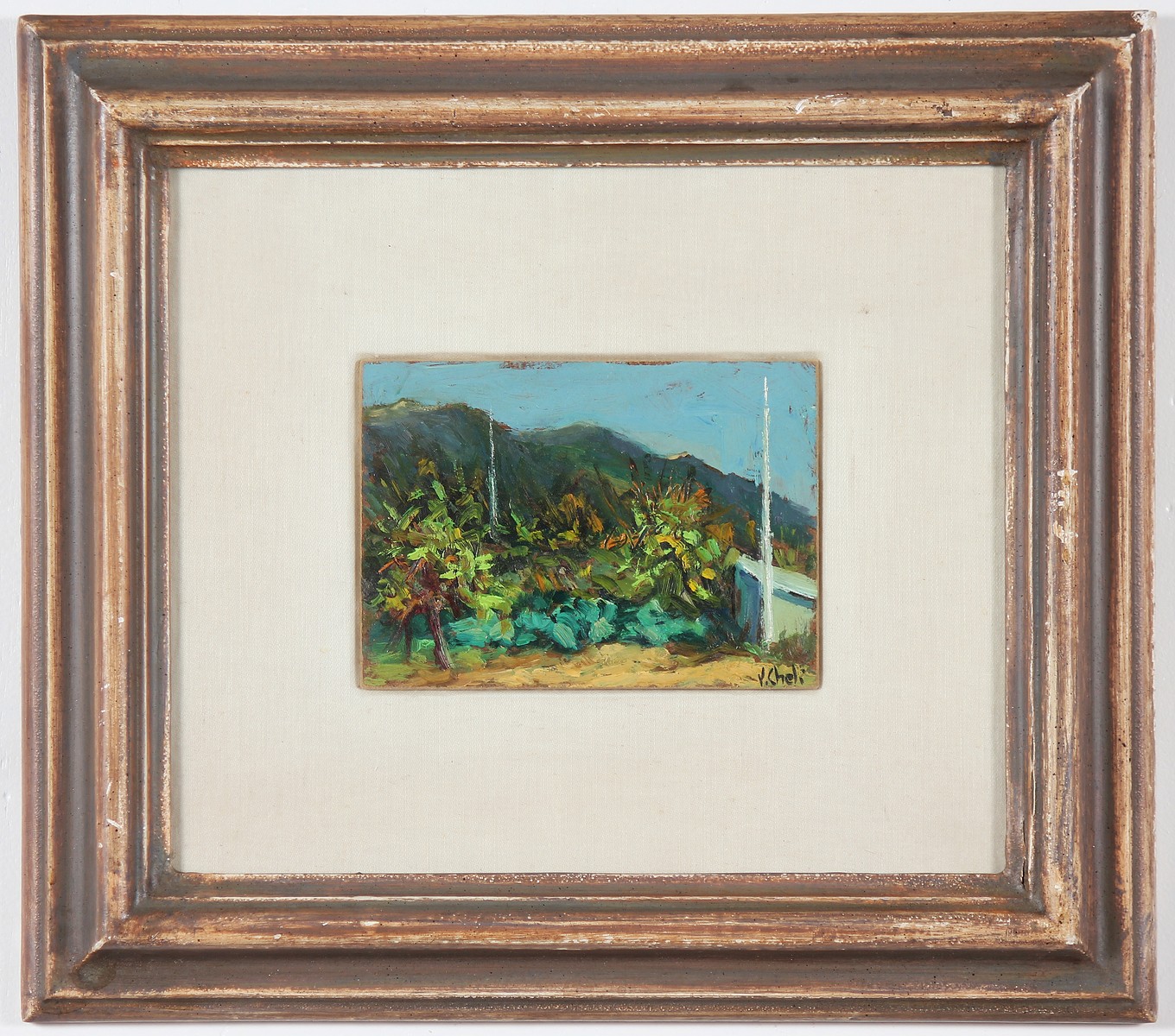 CHELI VALERIO (n. 1923) Paesaggio. Olio su cartone. Cm 14,00 x 10,20. Firma in basso a destra.