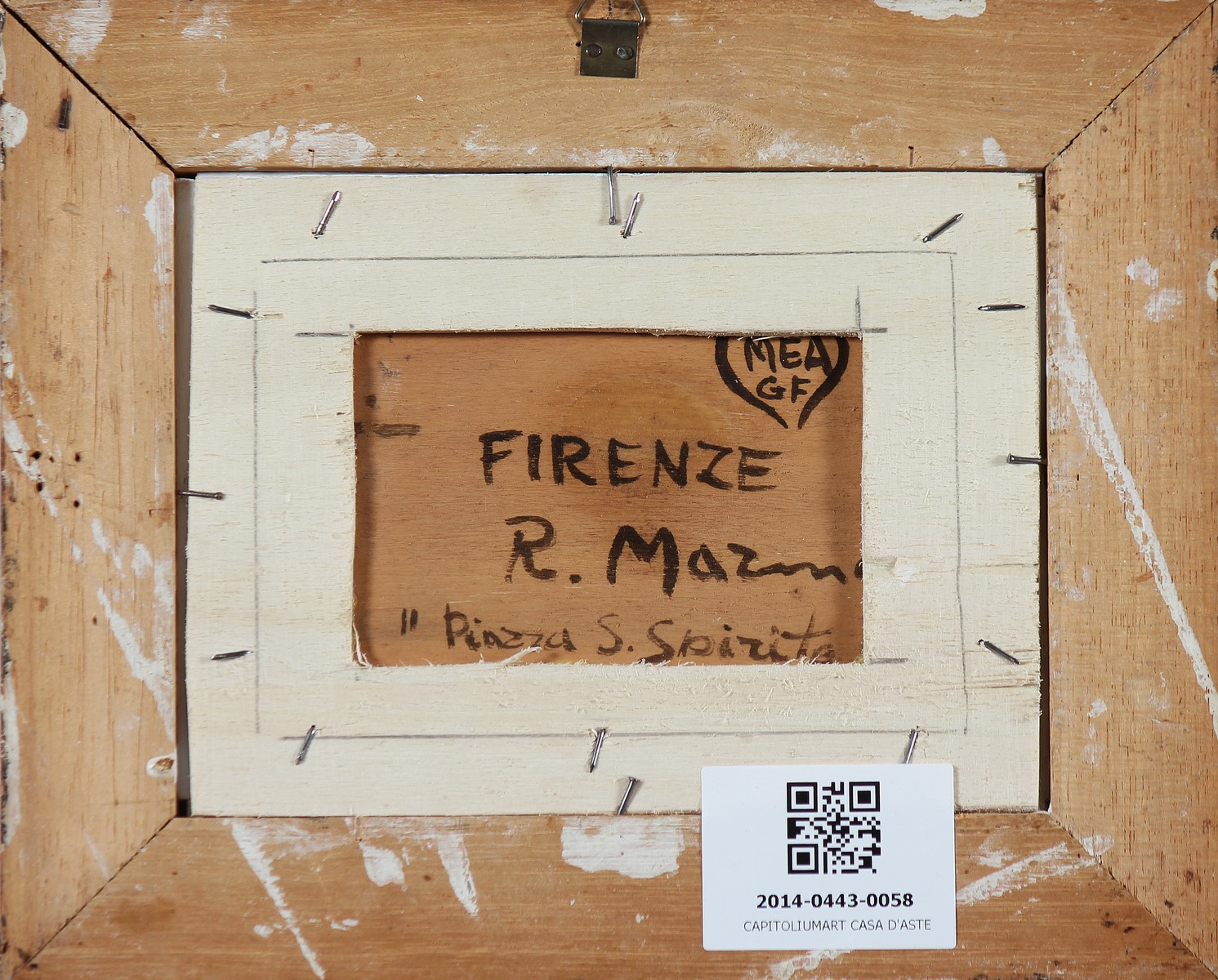 MARMA RODOLFO (1923 - 1999) LOTTO RITIRATO. Piazza Santo Spirito. 1979. Olio su tavola. Cm 15,00 x 10,00. LOTTO RITIRATO. Firma e anno in basso a destra. Titolo e firma al retro. Autentica dell'artista su fotografia.