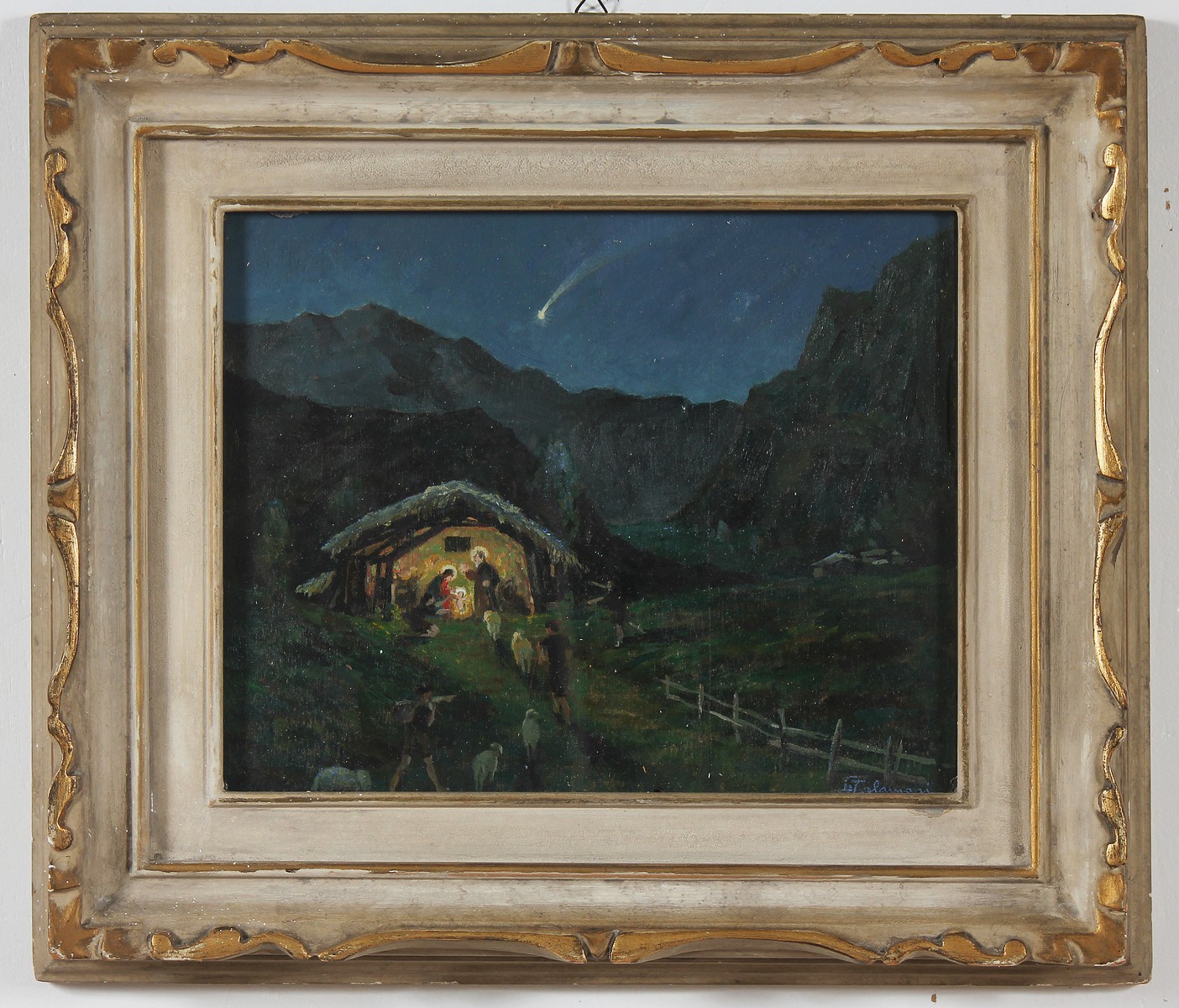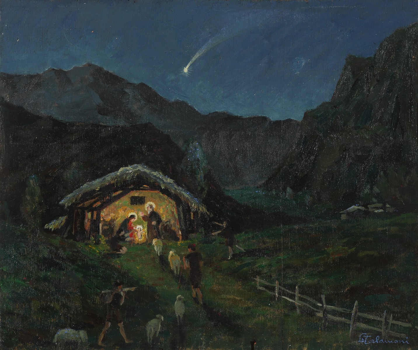 TALAMONI GIUSEPPE (1886 - 1968) Natività. Olio su tavoletta. Cm 28,50 x 24,00. Firma in basso a destra. Cornice presente