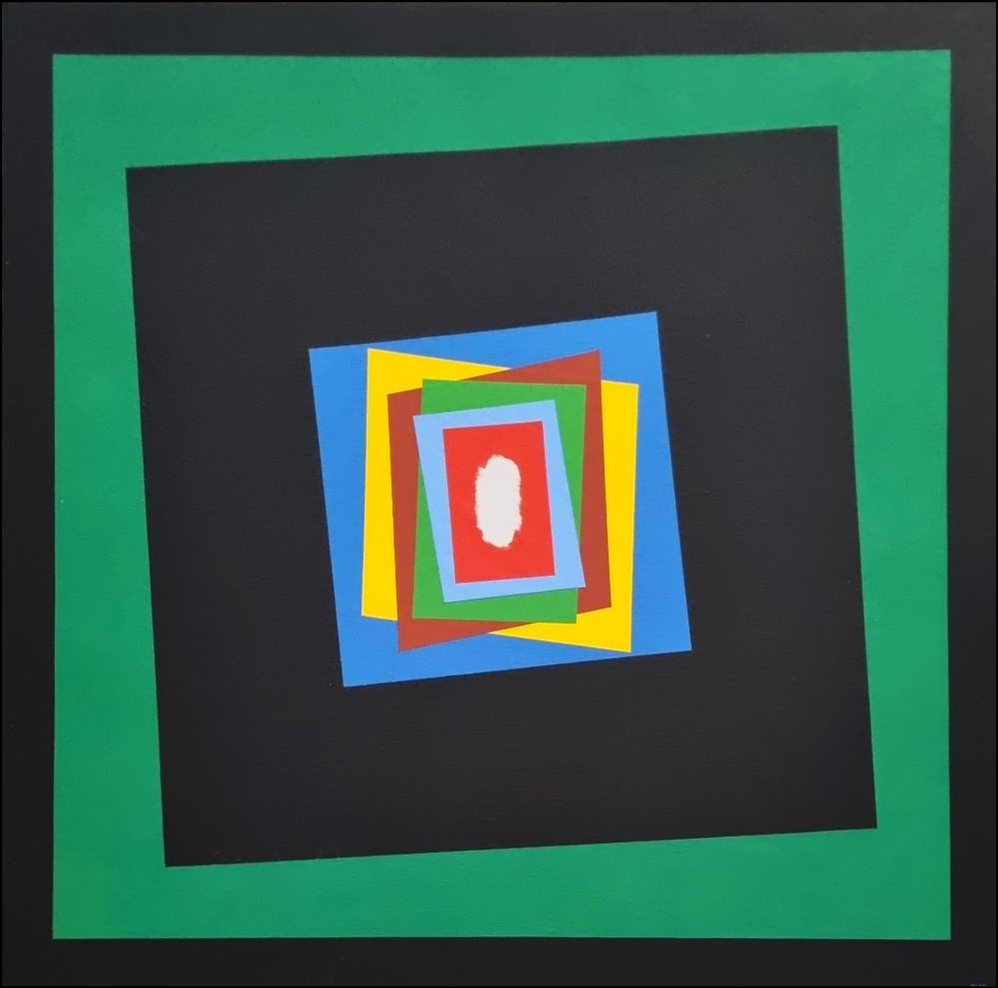 GARD FERRUCCIO Vestignè 1941 "Senza titolo" Acrilico e tecnica mista su tela cm 70x70 del 1989. Al verso firma, data, luogo e dedica di pugno dell'Artista al Presidente Giulio Andreotti. Accompagnato da dedica scritta su carta.