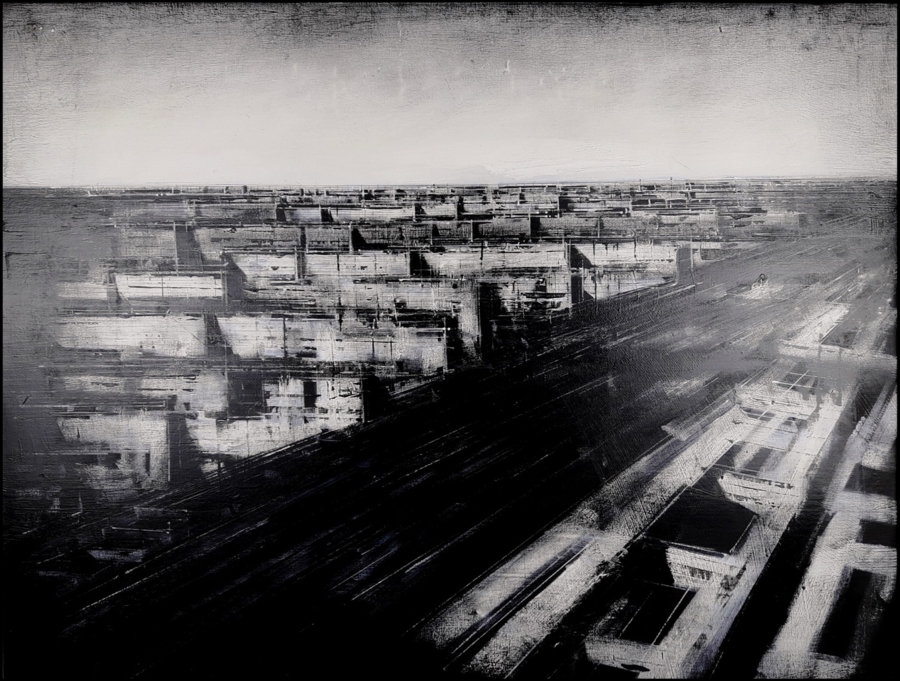 GUAITAMACCHI JONATHAN Londra 1961 "Ovest" Olio su carta intelata cm 80x60 del 2004. Al verso firma, titolo, data ed etichetta di provenienza della Galleria Real Arte di Sant'Elpidio. Autentica su foto.