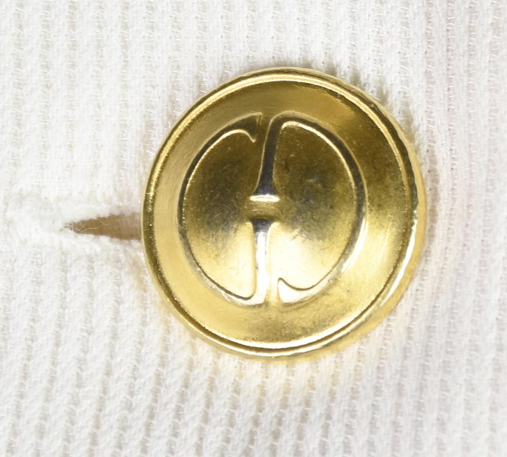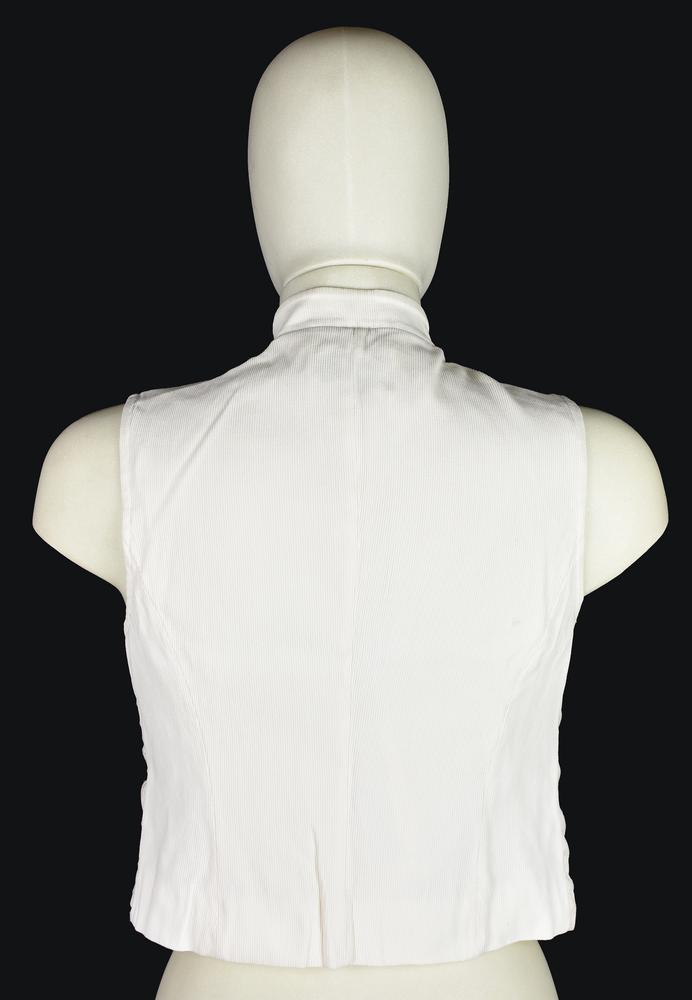 Top smanicato bianco a foggia di gilet. Presenta bottoni dorati con logo della Maison. Manca etichetta di composizione. Taglia 42 IT. Prodotto in Italia. Un leggero alone sul collo non compromette le ottime condizioni generale. Ben conservato.