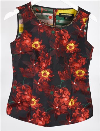 Top smanicato con motivo floreale e perline applicate al colletto. Cerniera laterale. Taglia S. Prodotto in Cina. Perfettamente conservato.