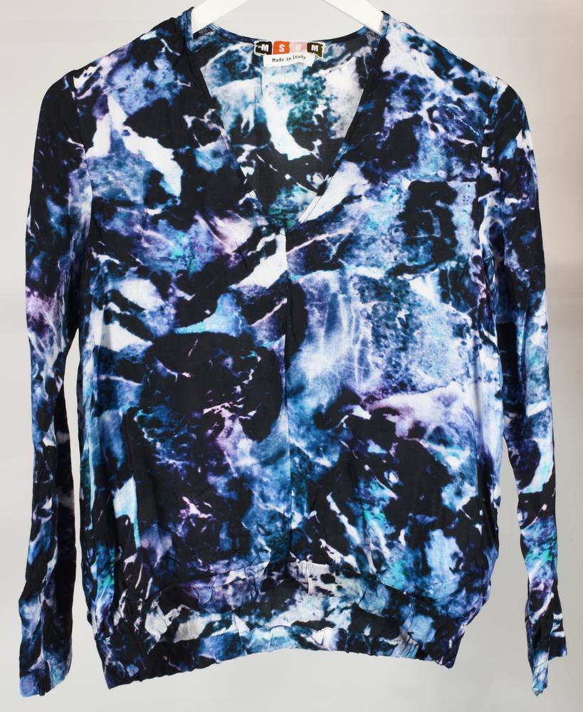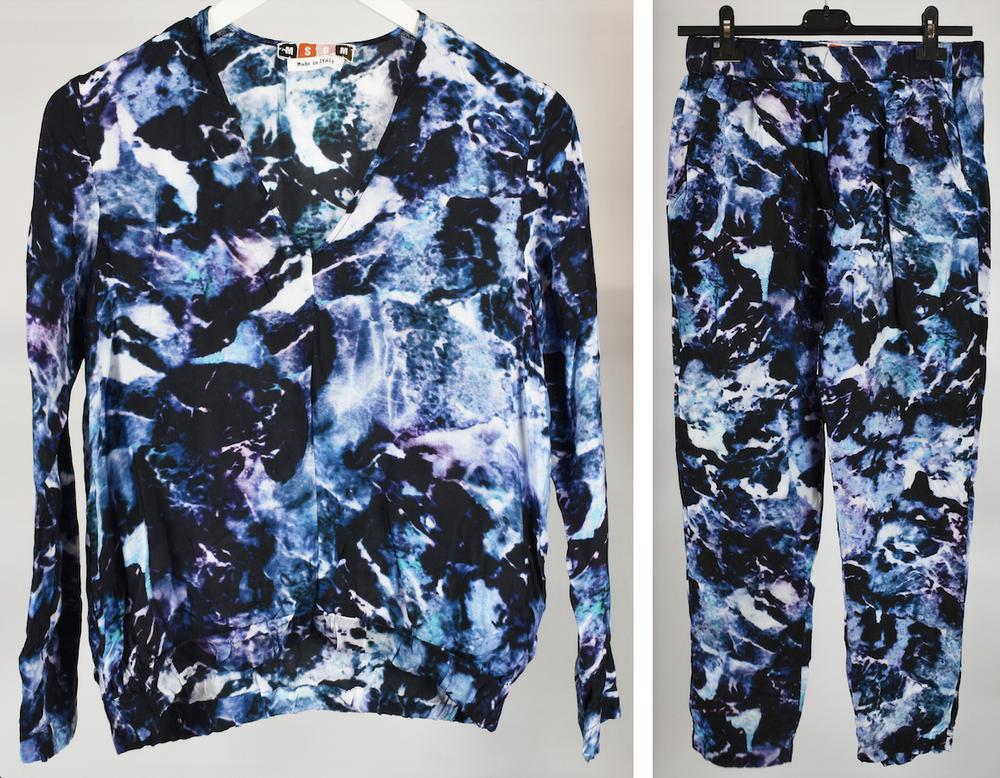 Completo in viscosa stampato composto da maglia e pantaloni. Taglia 38 per la maglia; taglia 40 per i pantaloni. Prodotti in Italia. Perfettamente conservato.