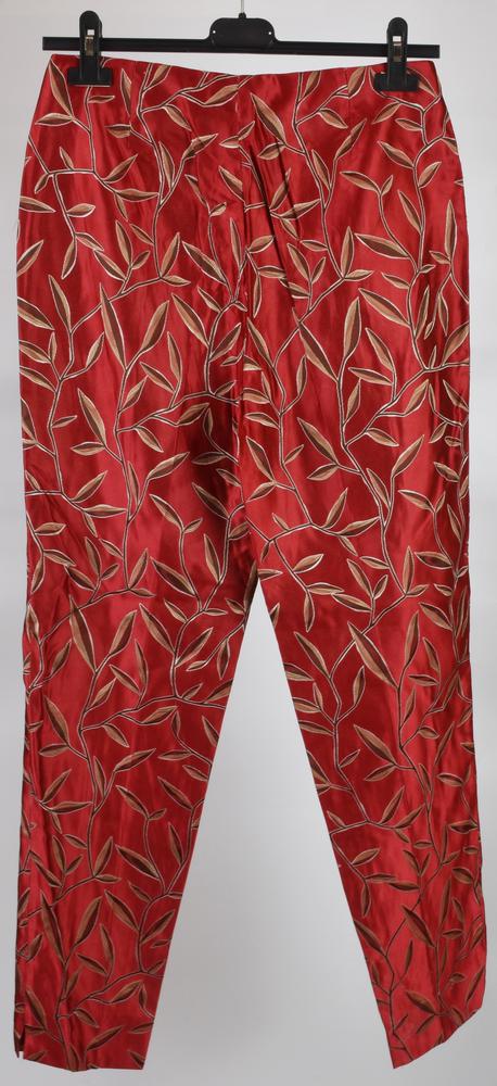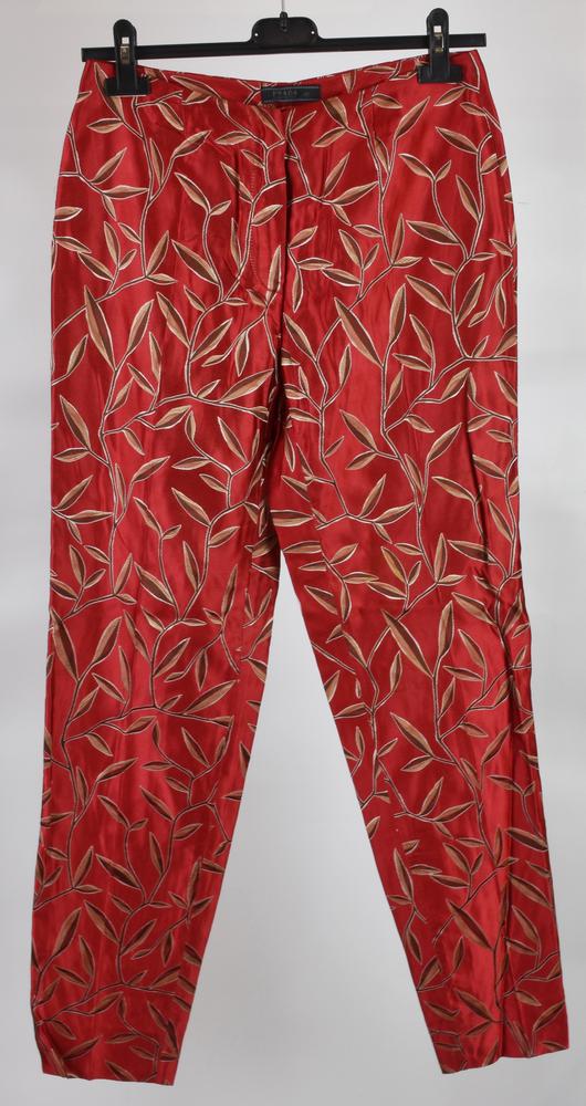 Pantalone in seta con decori floreali a ispirazione orientale. Collezione SS 1997. Taglia 42. Prodotti in Italia. Qualche segno d’uso ma buone condizioni generali. Ben conservati.