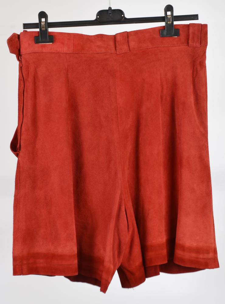 Suede shorts with a silk lining featuring a logo. Two front pockets and belt loops. Side closure with a zipper and button. Size 40 FR. Made in France. Well preserved.