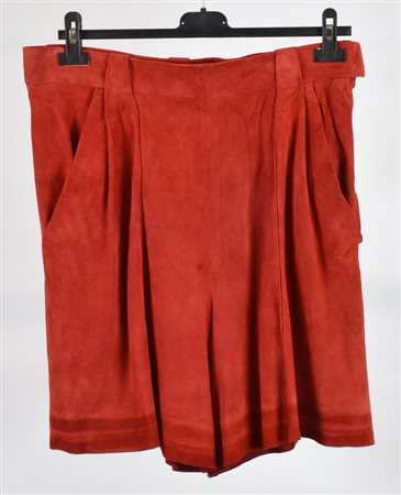 Shorts in suede con fodera in seta con logo. Due tasche frontali e passanti. Chiusura laterale con cerniera e bottone. Taglia 40 FR. Prodotto in Francia. Ben conservato.