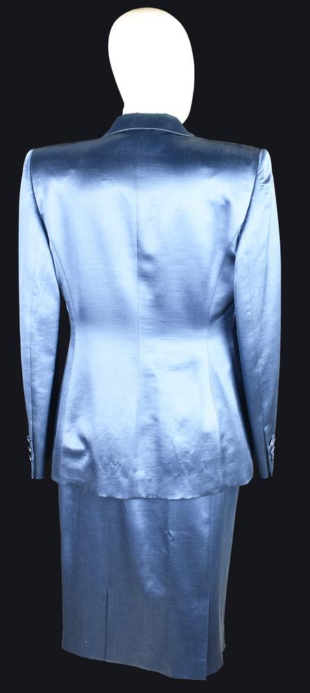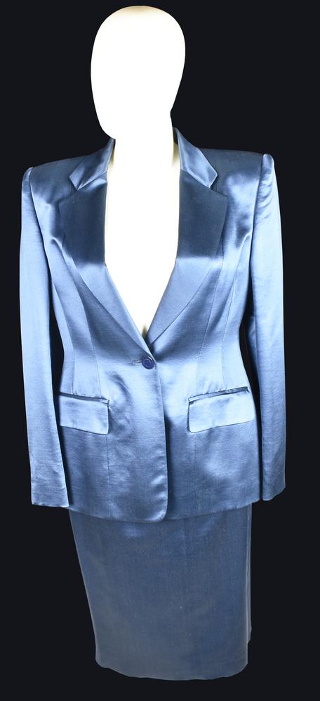 Tailleur in lana e seta. La giacca presenta spalline imbottite e fodera interna in cupro loggata, due tasche esterne con patta e un taschino interno. Bottoni ton sur ton con logo della Maison. Taglia 44 IT. Prodotto in Italia. Ben conservato.