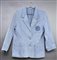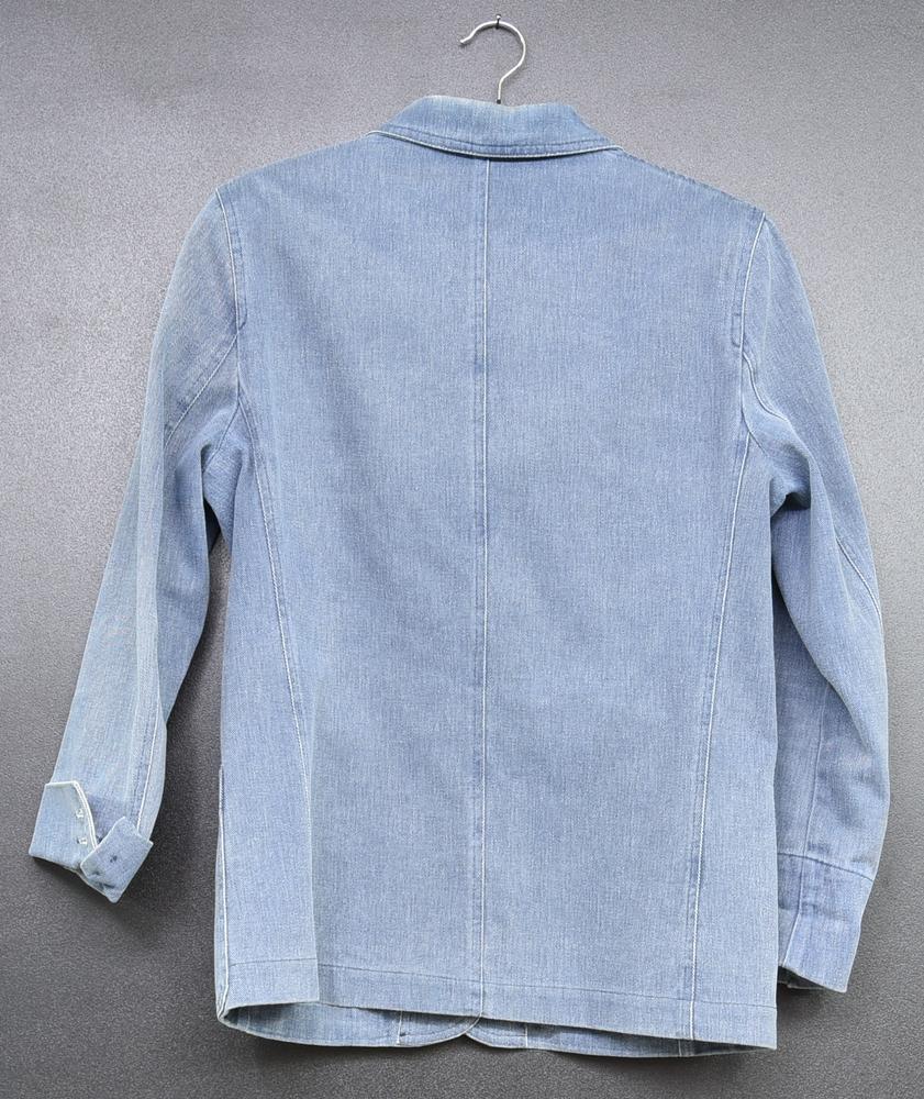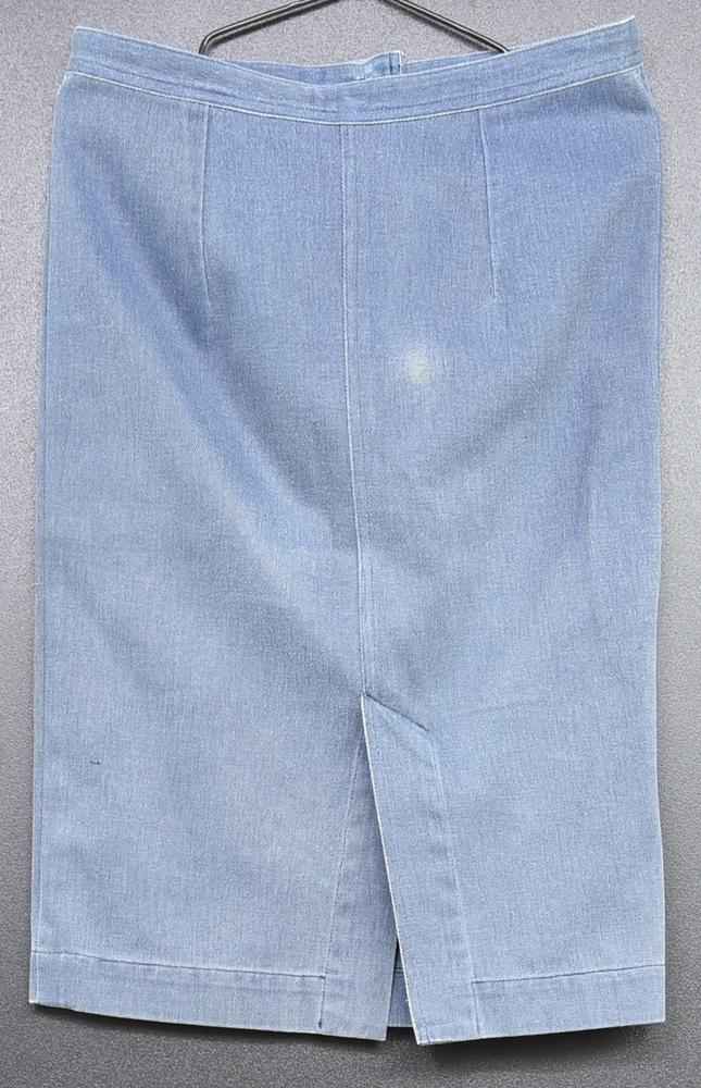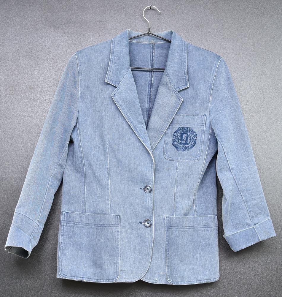 Denim suit consisting of a skirt and jacket. The jacket features a two-button closure, padded shoulders, two front pockets, and an embroidered logo on the chest pocket. Size 48. Missing composition tag. Some stains and fading. Well preserved.