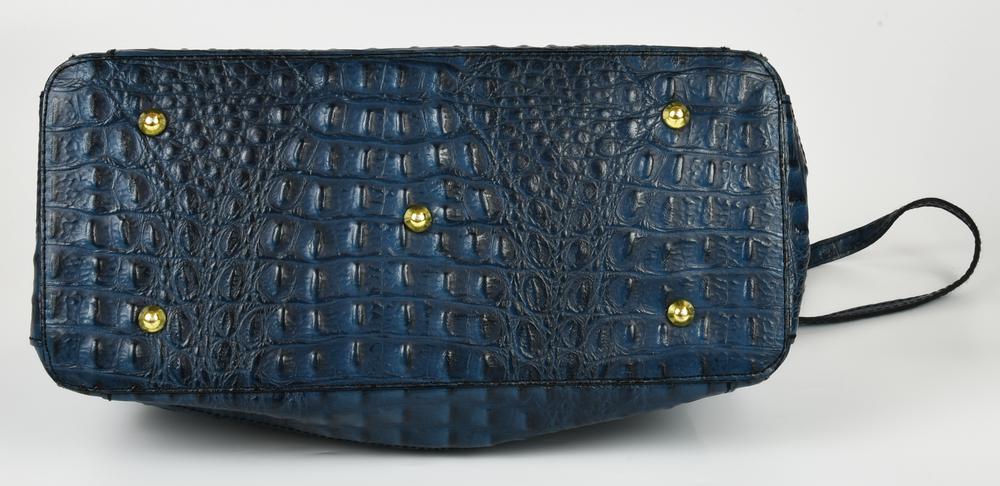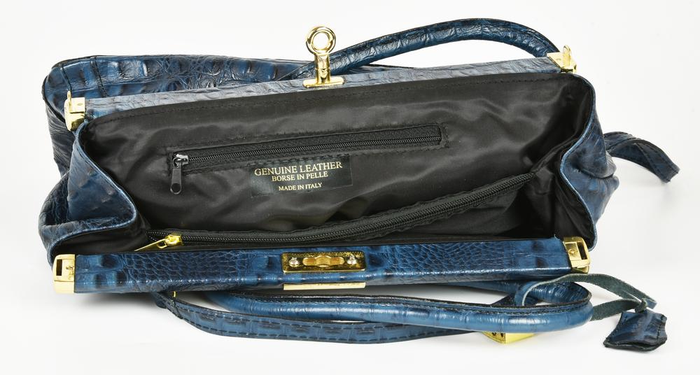Borsa modello Doctor Bag in pelle blu stampa coccodrillo. Doppi manici, chiusura centrale a scatto e tracolla rimovibile. Interno in tessuto organizzato in tre vani, uno chiuso con cerniera, due taschini laterali uno applicato e uno chiuso con cerniera. All’esterno reca un taschino posteriore chiuso con cerniera. Presenta clochette con lucchetto e chiavi Hardware in metallo dorato. Cm 33,00x25,50x15,00. Altezza coi manici cm 38,00. Prodotta In Italia. Ottime condizioni generali. Ben conservata.