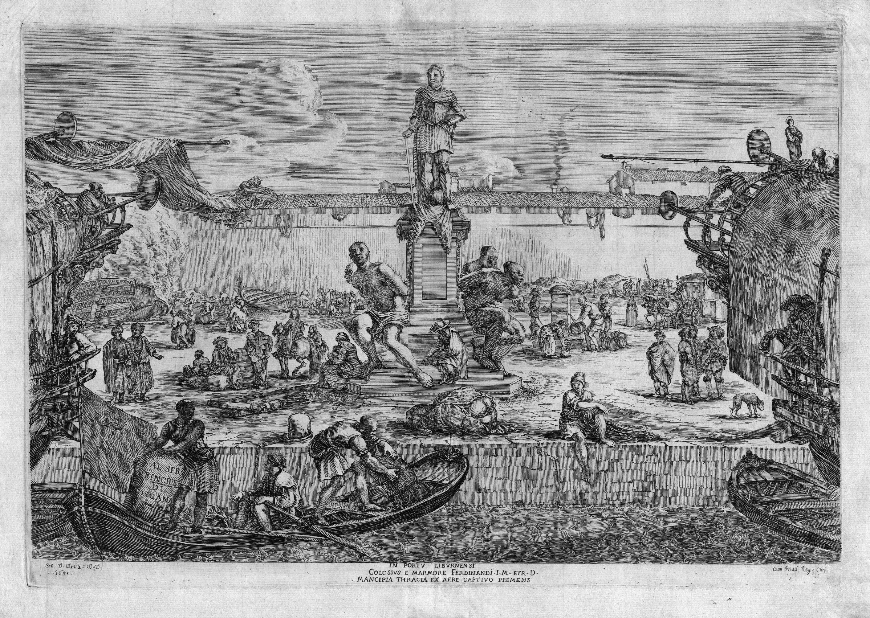 Firmata e datata sulla lastra in basso a sinistra. Prima tavola da Vedute del Porto di Livorno, serie di 6 incisioni realizzate nel 1655. II stato su 2 dopo l’iscrizione in basso.