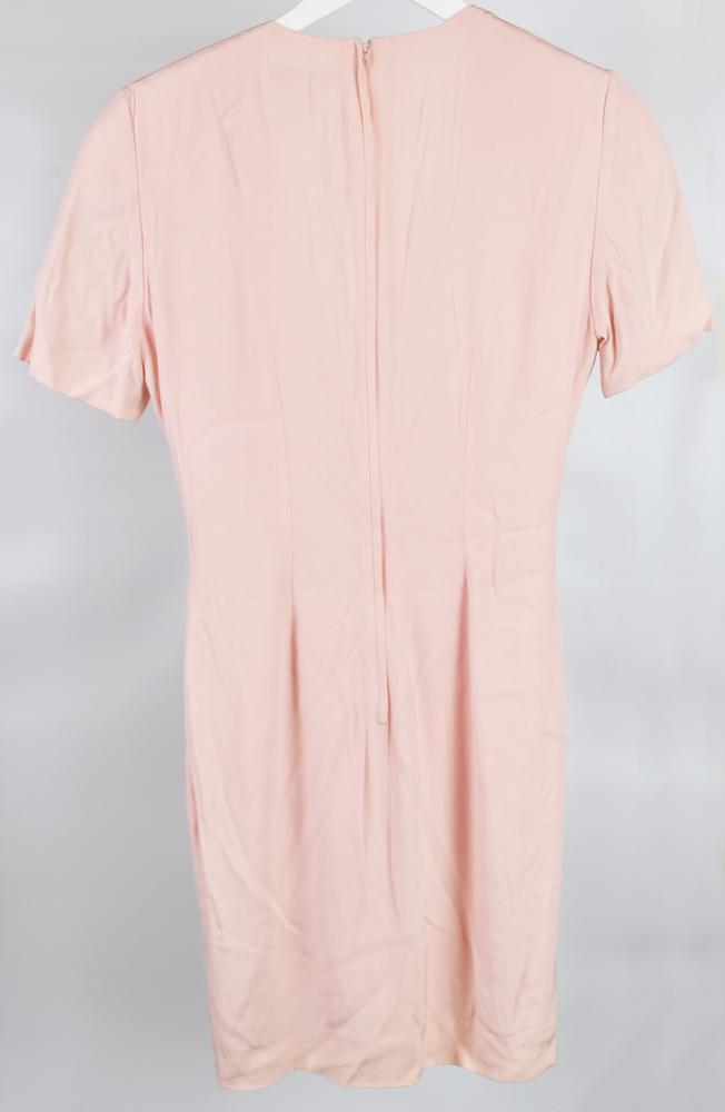Abito rosa con scollo a V e arricciatura in vita. Cerniera posteriore e spalline imbottite. Taglia 40 FR. Prodotto in Francia. Segni d’uso e piccole macchie. Ben conservato.