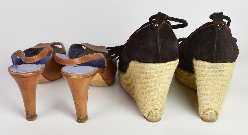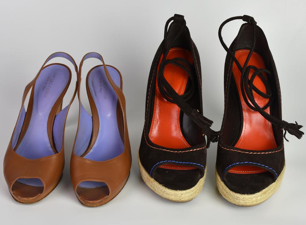 SERGIO ROSSI zeppe in pelle e corda con laccio alla caviglia. Zeppa 13 cm. Taglia 40. Proposte con scatola e dustbag originale. Prodotte in Spagna. Segni d’uso e difetti. Ben conservate.