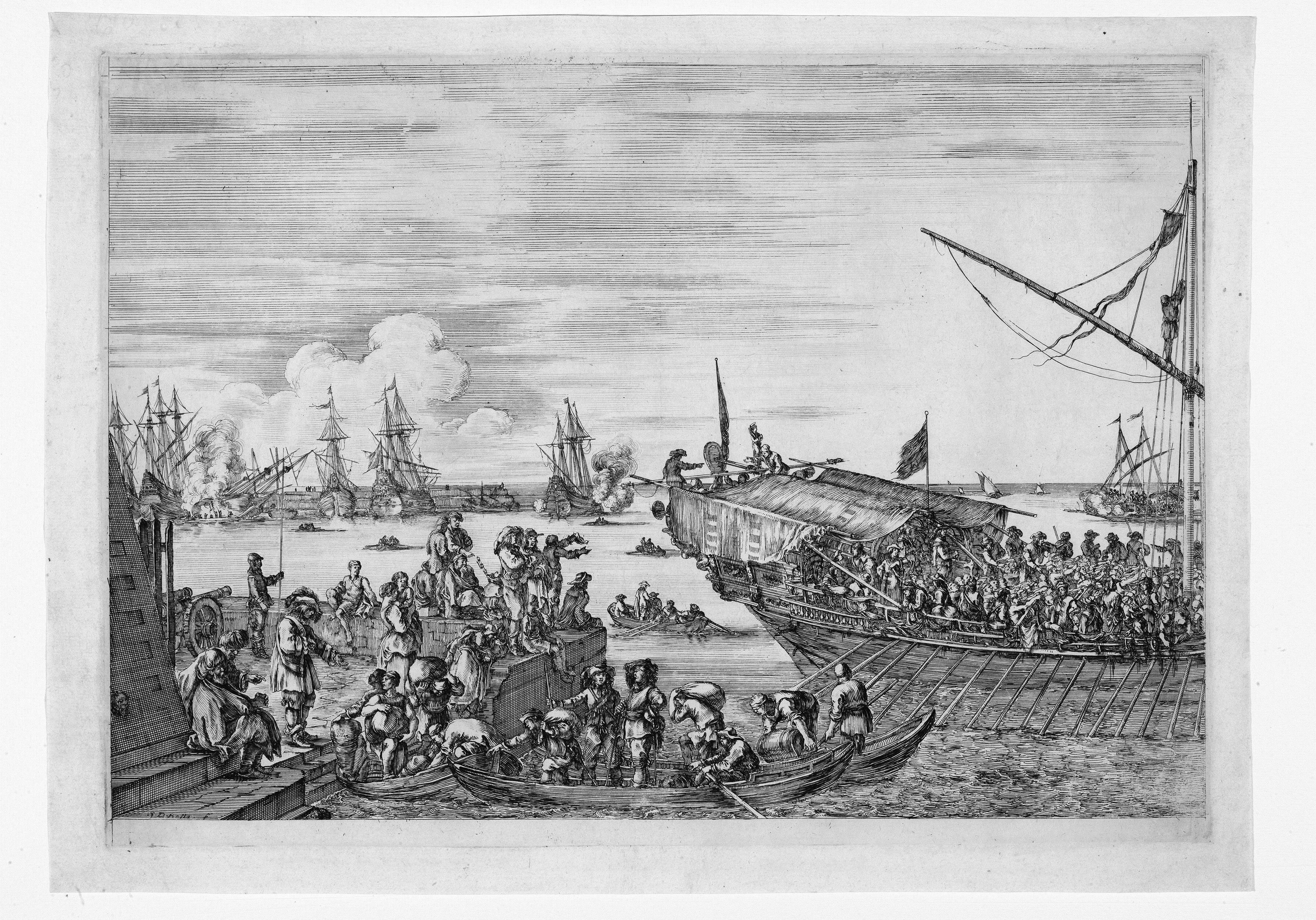 Firmata sulla lastra in basso a sinistra e monogrammata e datata “1654” sul sacco di uno degli scaricatori. Terza tavola da Vedute del Porto di Livorno, serie di 6 incisioni realizzate nel 1655. II stato su 2.