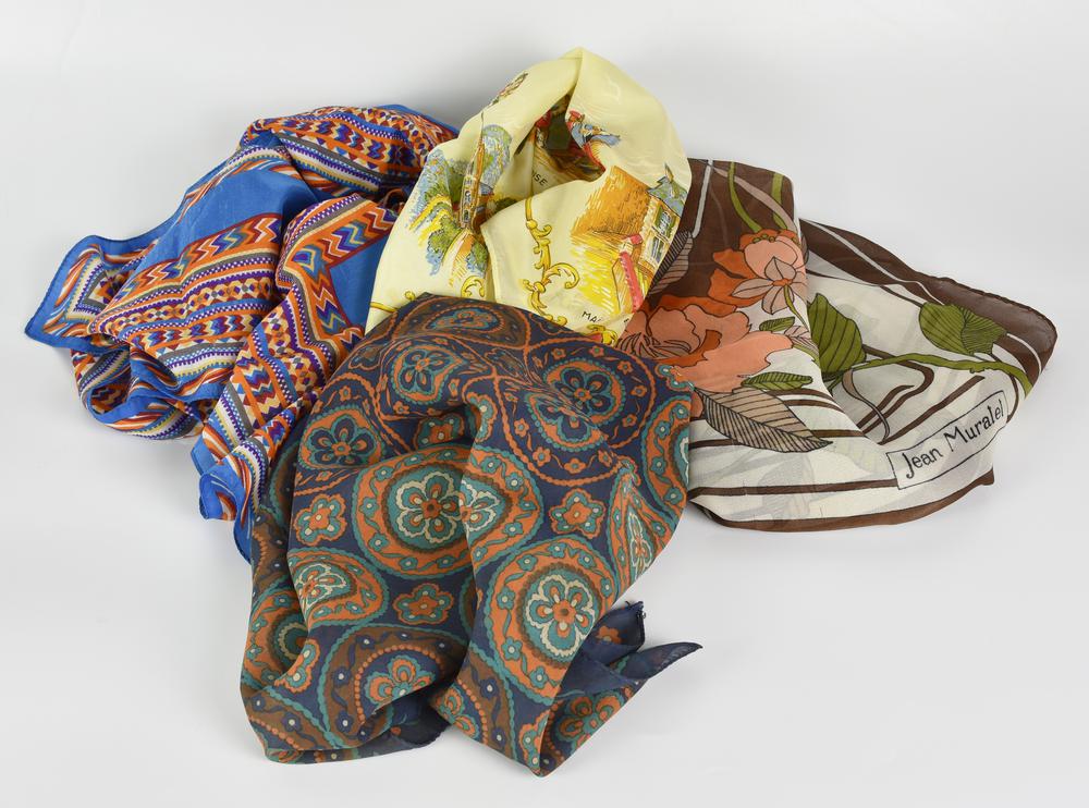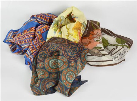 Lotto composto da 4 foulard di materiali e dimensioni varie. Mancano le etichette di composizione. Qualche difetto e segno d’uso ma in generale ben conservati.