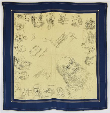 Foulard probabilmente in seta con stampa dedicata a Leonardo da Vinci. Cm 85,00x81,00. Manca etichetta di composizione. Lievi segni d’uso. Ben conservato.