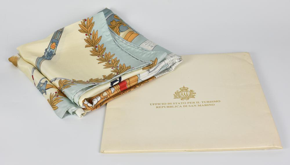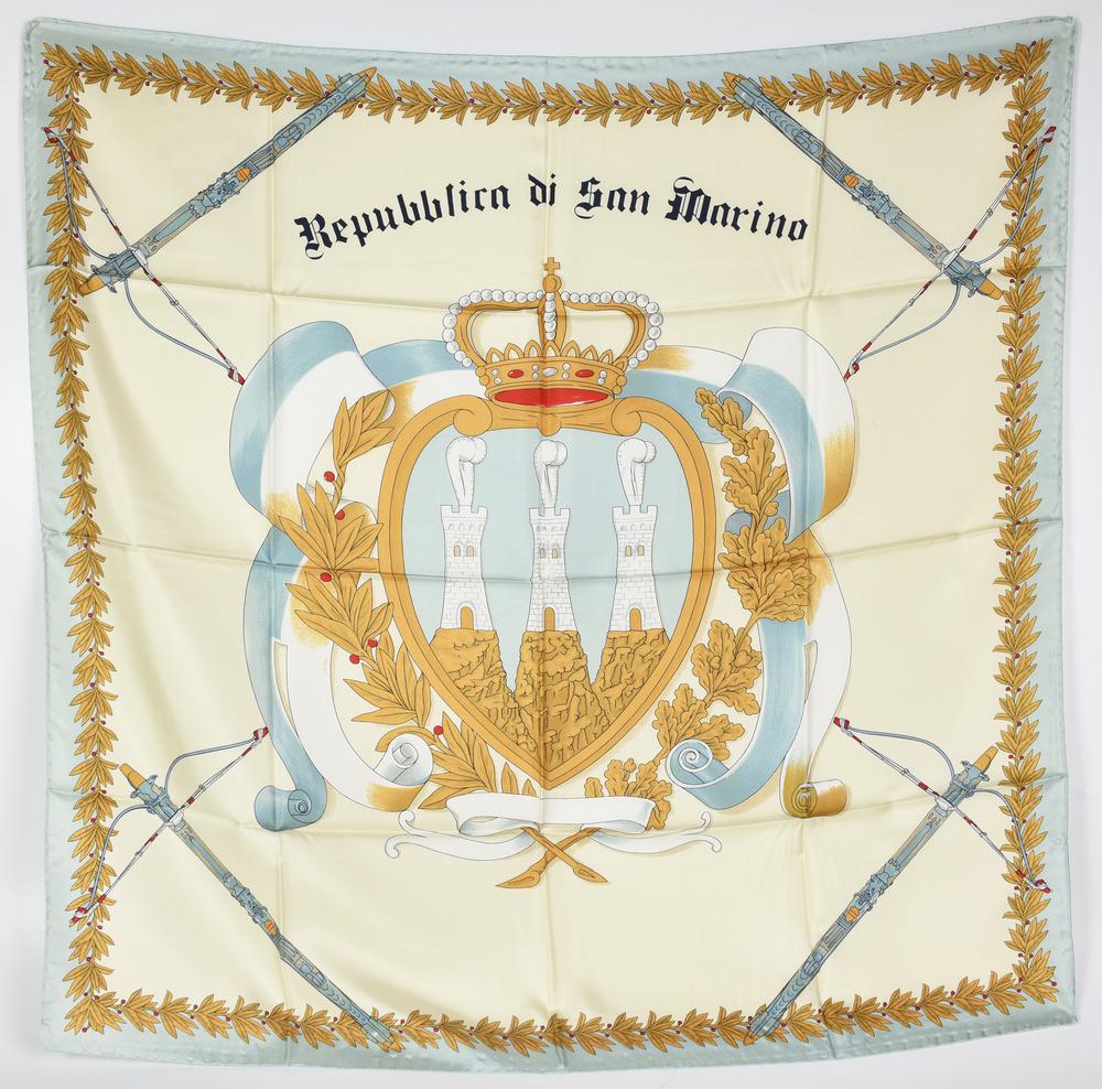 Silk scarf depicting the coat of arms of the Republic of San Marino. Dimensions: 88x86 cm. Presented with the original box. Made in Italy. Perfectly preserved.