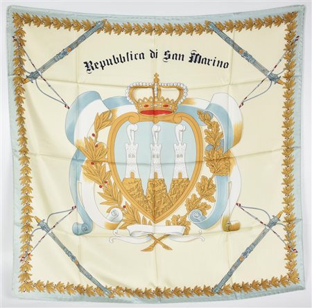 Foulard in seta con raffigurato lo stemma della Repubblica di San Marino. Cm 88x86. Presentato con scatola originale. Prodotto in Italia. Perfettamente conservato.