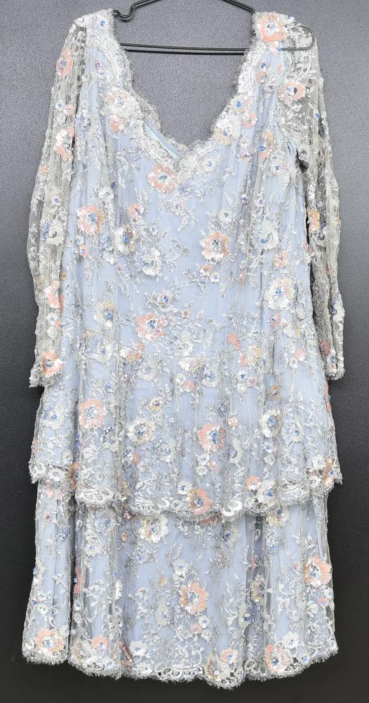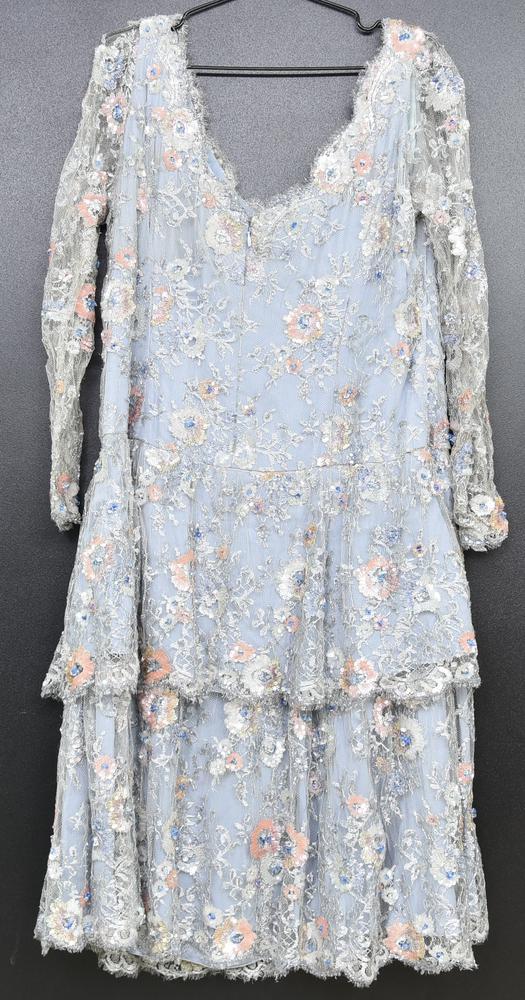 Abito azzurro con decoro di paillettes. Manca etichetta di taglia e composizione. Made in Italy. Lavorazione sartoriale. Vista la natura dell’articolo non si escludono piccole mancanze. Ben conservato.