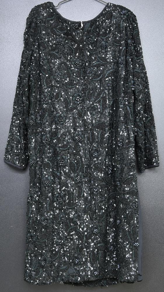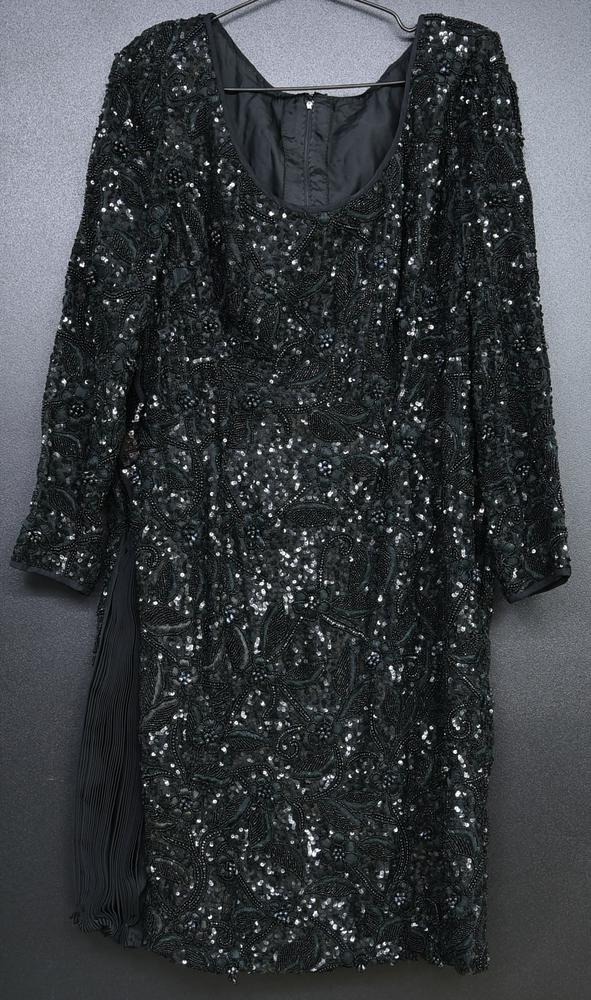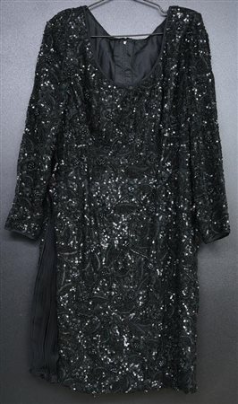 Abito nero con decoro di paillettes. Manca etichetta di taglia e composizione. Made in Italy. Lavorazione sartoriale. Vista la natura dell’articolo non si escludono piccole mancanze. Ben conservato.