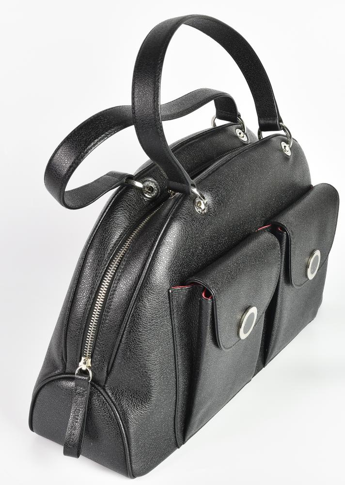 Black leather handbag with two handles, zipper closure. Raspberry-colored interior, organized into a large compartment and two side pockets, one expandable and one with zipper. On the outside, it has two front pockets with magnetic closure. Chrome metal hardware engraved with the Maison's logo. Dimensions: 39x23x13 cm. Height with handles 39 cm. Supplied with original dustbag. Product reference code: BNMLLG. Made in Italy. Excellent conditions, like new, still with protective films on the closures of the external pockets.