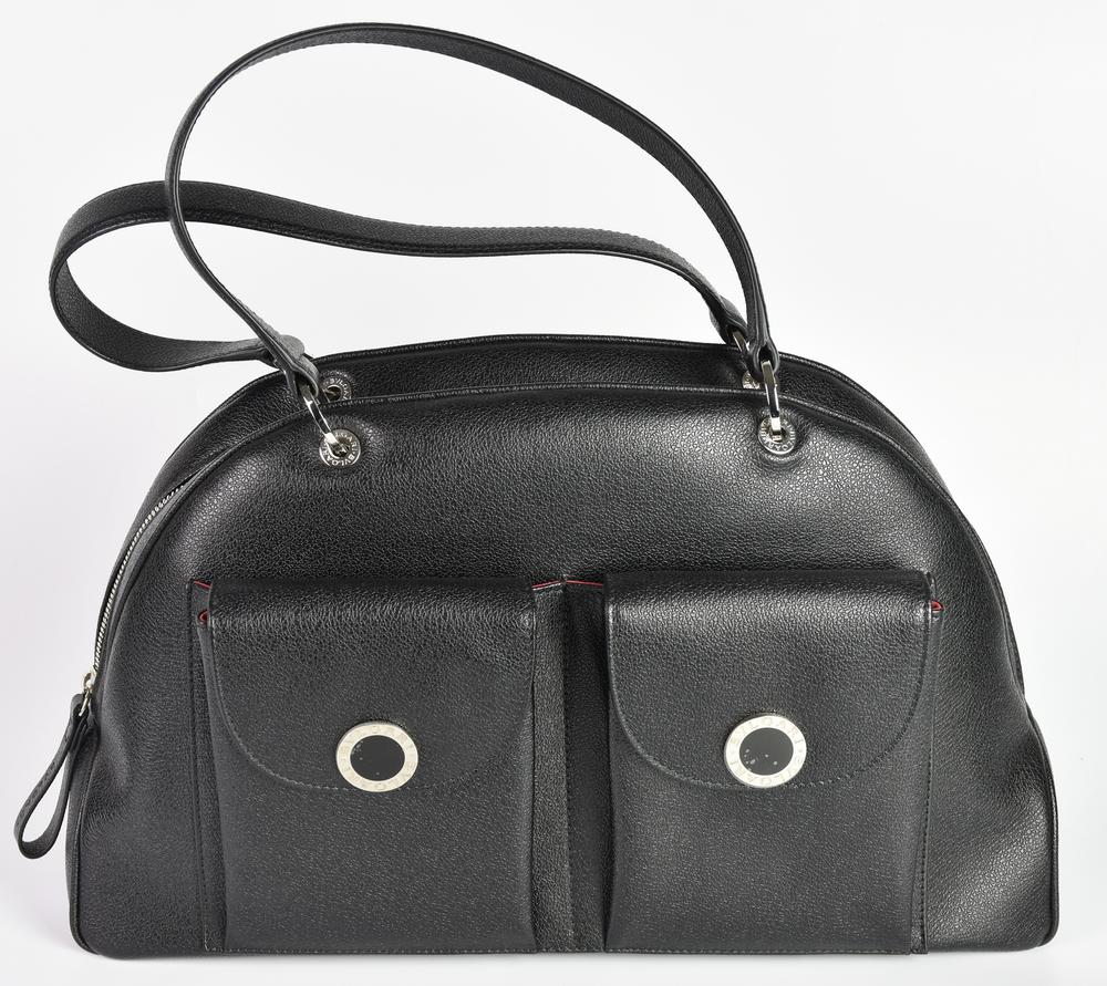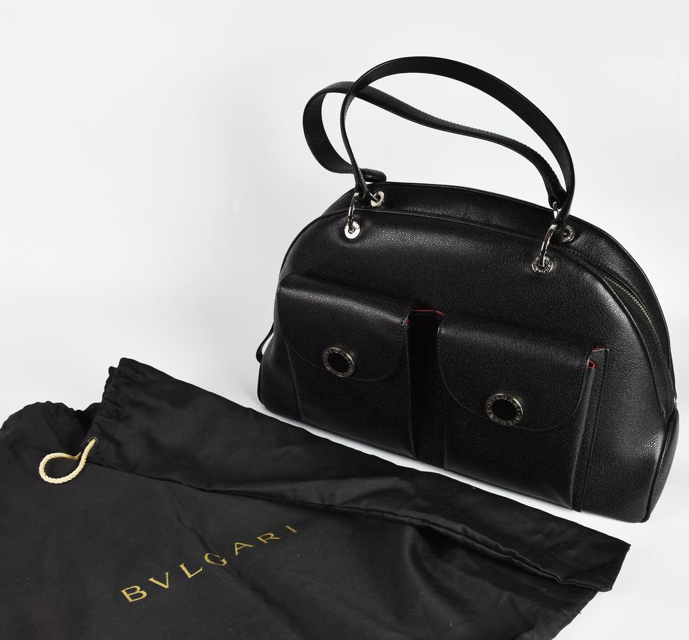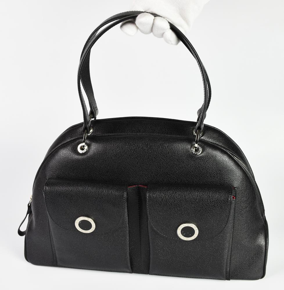 Bulgari BLACK LEATHER HANDBAG DESCRIPTION: Black leather handbag with two...