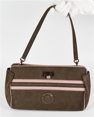 Borsa a spalla in tessuto color tortora e inserti malva. Tracolla rimovibile e chiusura a scatto. Interno organizzato in un unico vano con taschino laterale con cerniera e moschettone porta chiavi. Cm 30,00x19,00x7,50. Altezza col manico cm 44,00. Prodotta in Italia. Presenta segni d’uso ma in generale ben conservato.