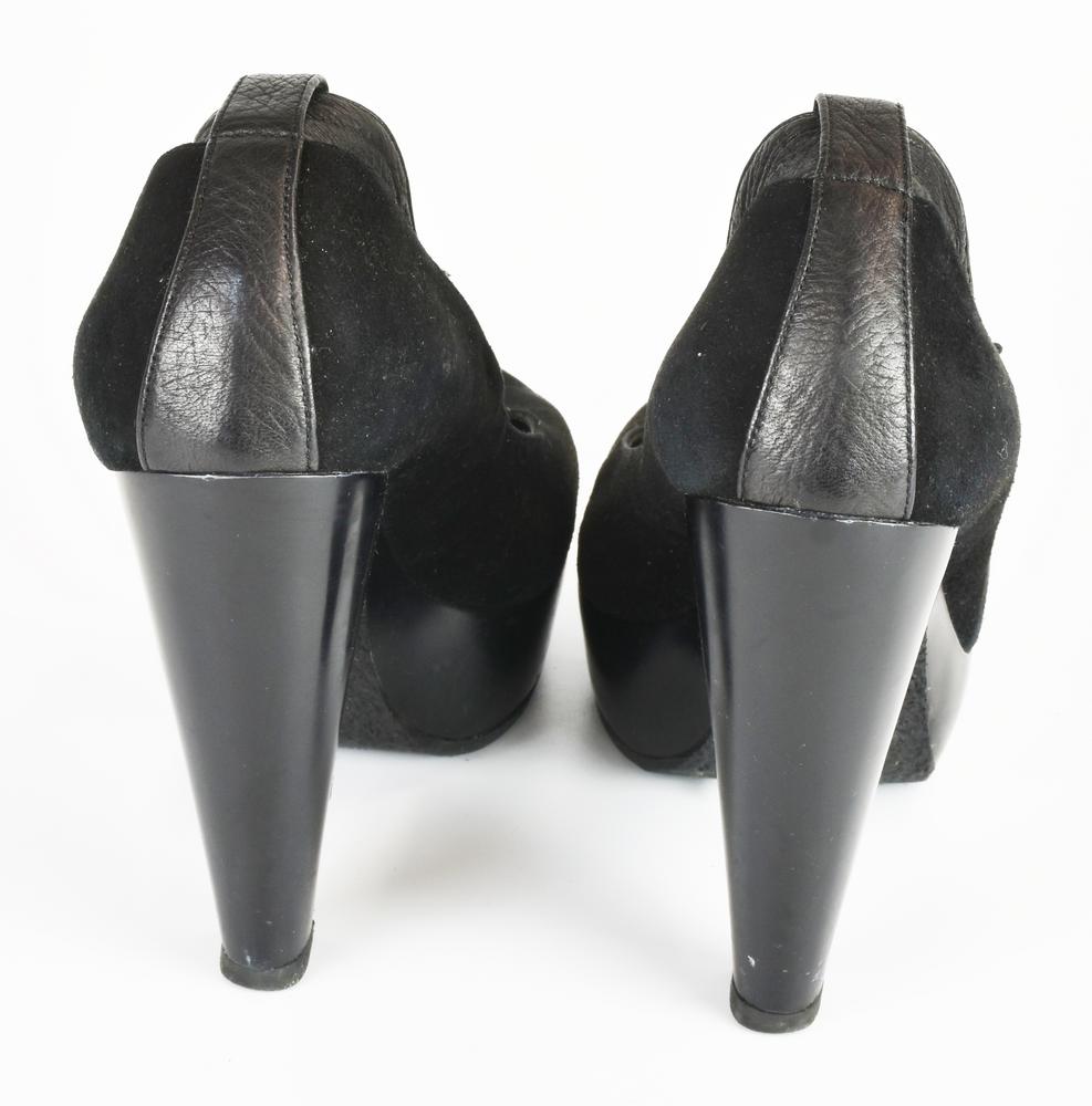 Decollete’ in suede con laccio alla caviglia in pelle. Tacco di 13.5 cm e plateau di 3.5 cm. Taglia 40. Prodotto in Italia. Qualche segno d’uso. Ben conservate.