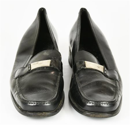 Mocassini in pelle con etichetta metallica sul fronte. Taglia 36.5. Prodotti in Italia. Segni d’uso. Discretamente conservate.