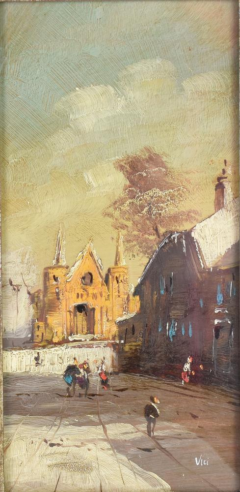 Ignoto PAESAGGIO CITTADINO olio su tavola, cm 18x9 firma