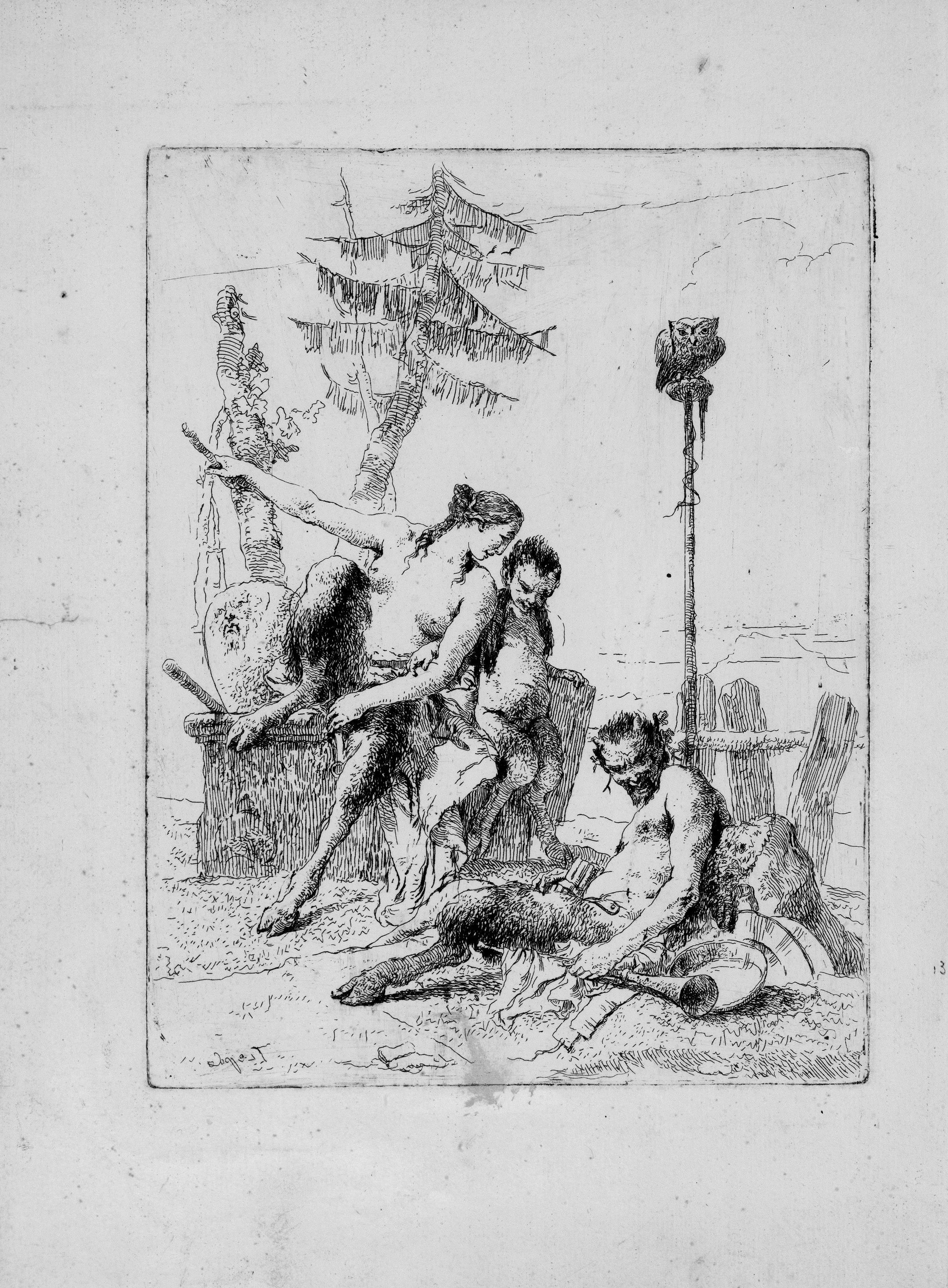 Firmata in controparte sulla lastra in basso a sinistra. Dalla serie Scherzi, pubblicata per la prima volta nel 1775 da Giandomenico Tiepolo in un primo gruppo di 14 tavole prima della numerazione. I stato su 2 prima delle numerazione.