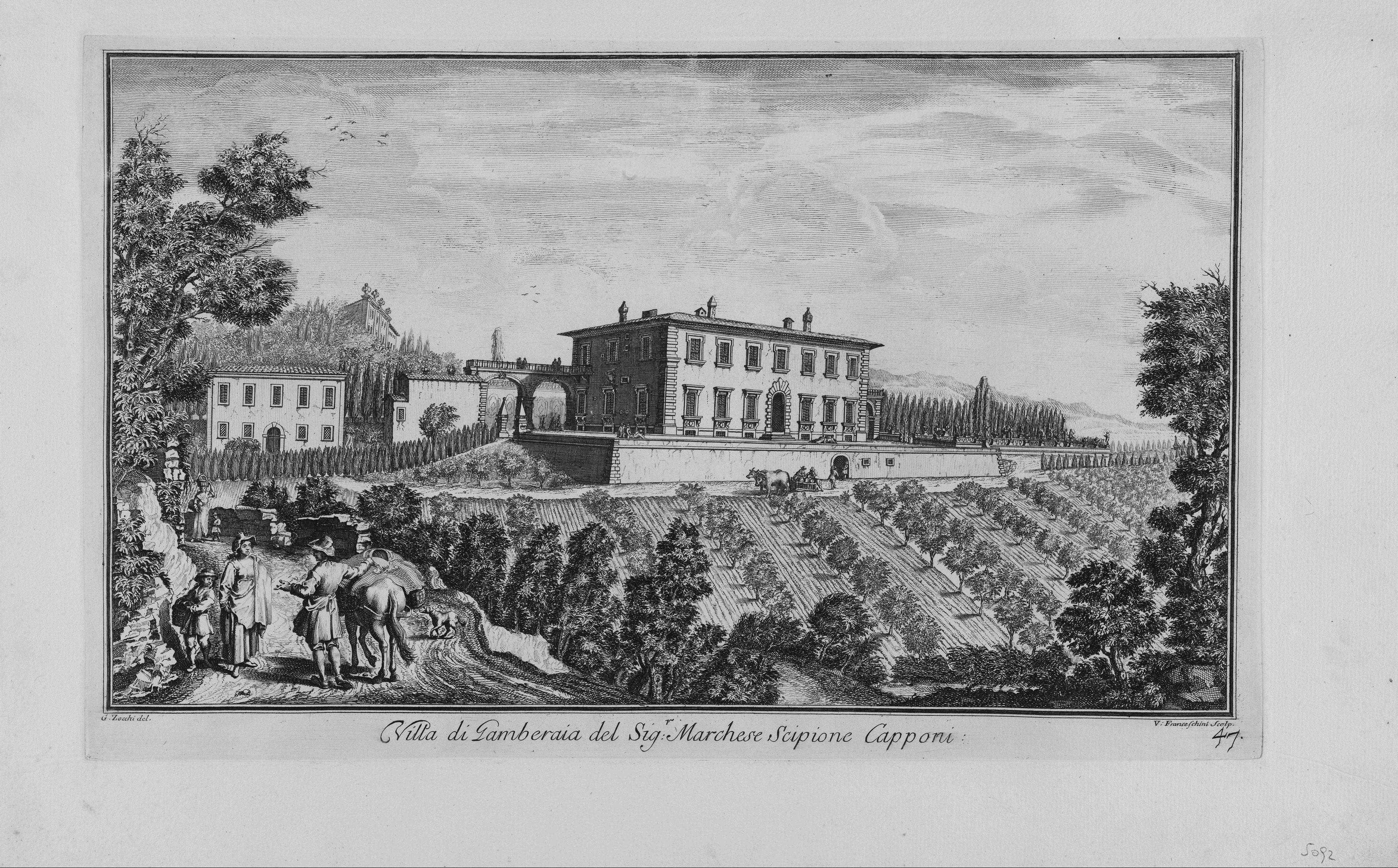 Tavole da Vedute delle ville e d’altri luoghi della Toscana incise su disegni dello Zocchi per conto del Marchese Gerini e pubblicate a Firenze fra il 1744 ed il 1757. II stato su 2 dopo la numerazione.