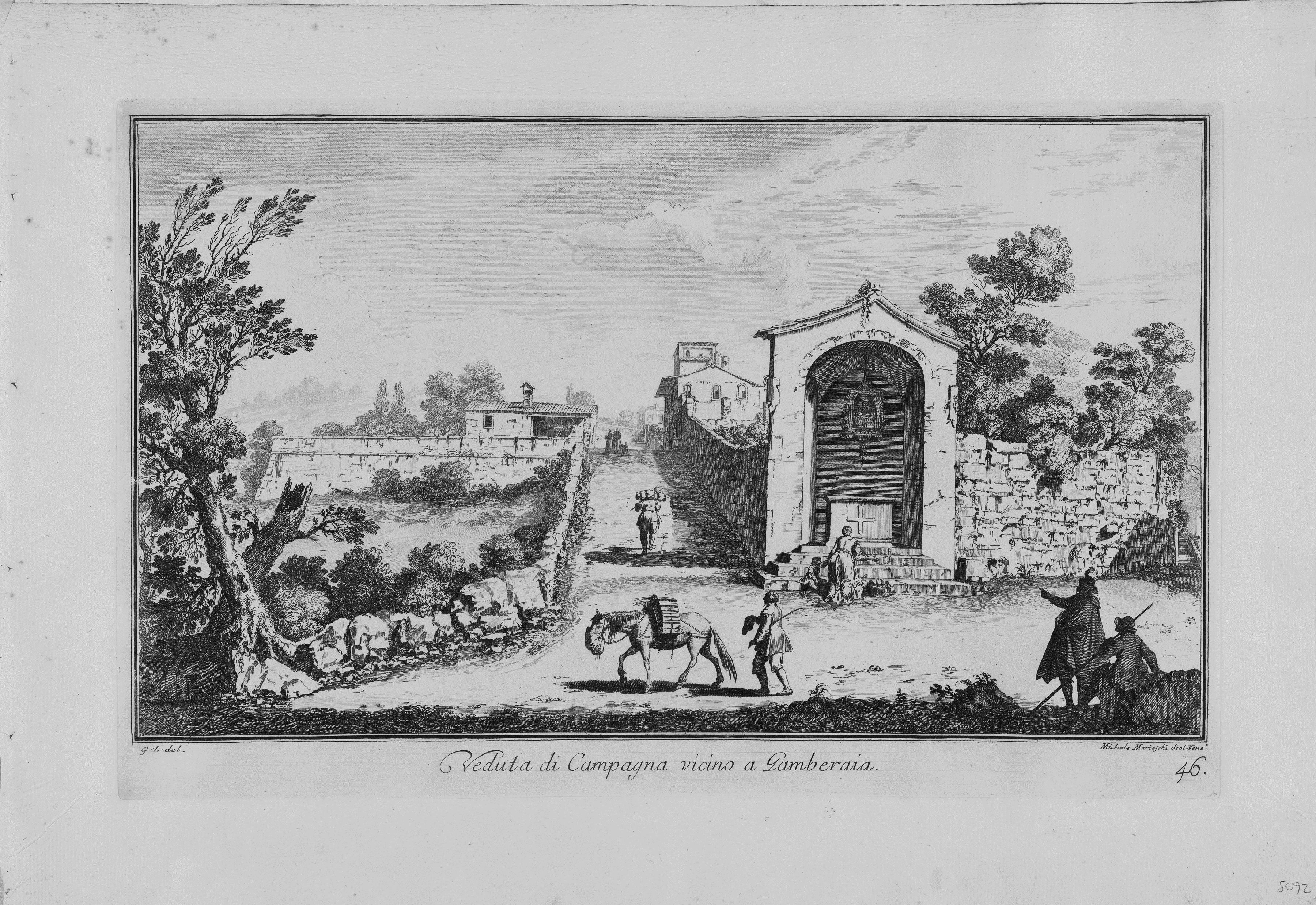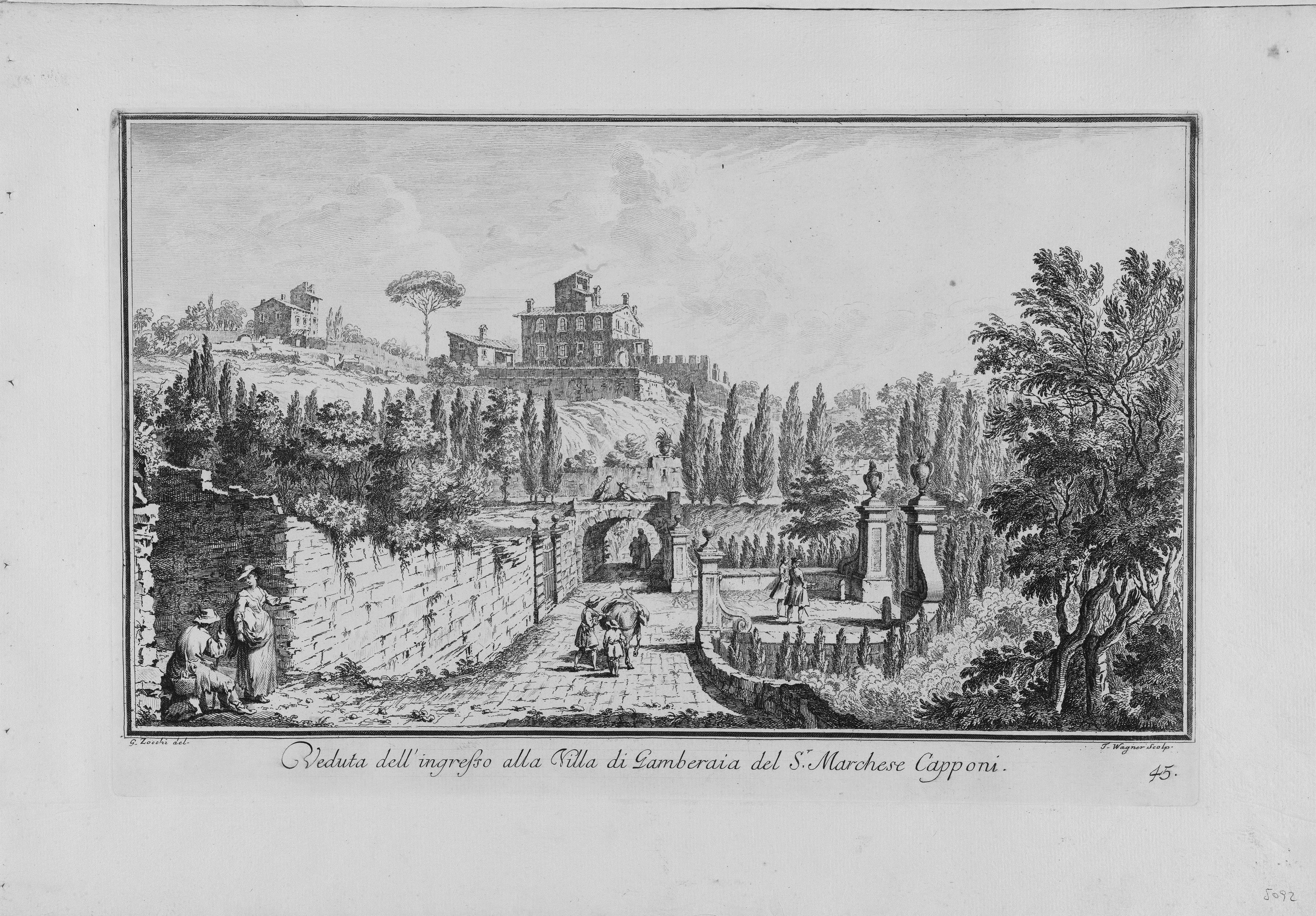 Veduta dell’ingresso alla Villa di Gamberaia. Acquaforte. mm 304x482. Mason, 74. Bevilacqua, 45.