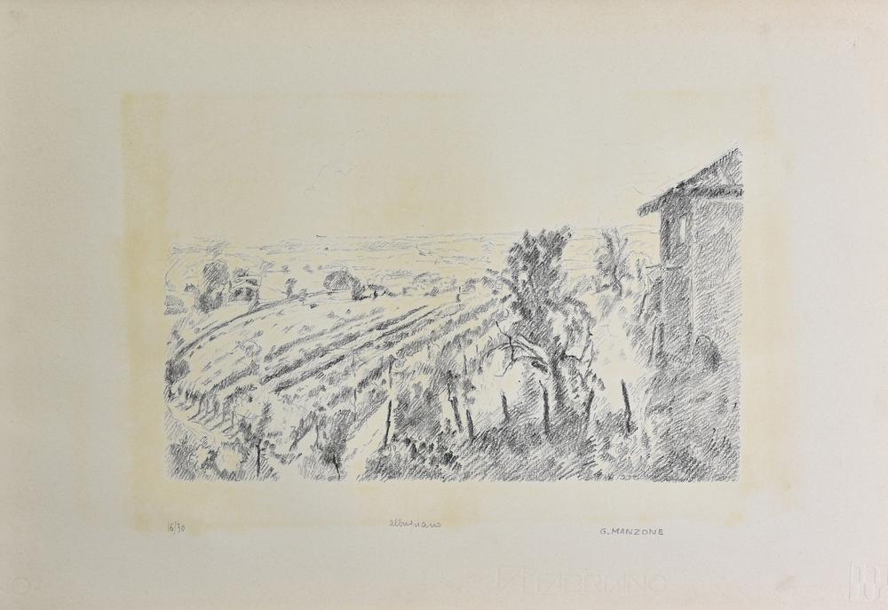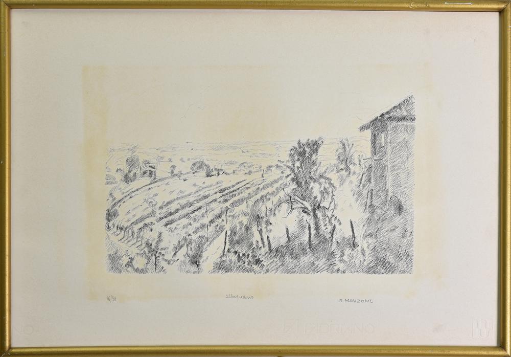 Lot 123 | Giuseppe Manzone VEDUTA SU VIGNETO litografia su carta, cm 33x50; es. 16/30...
