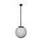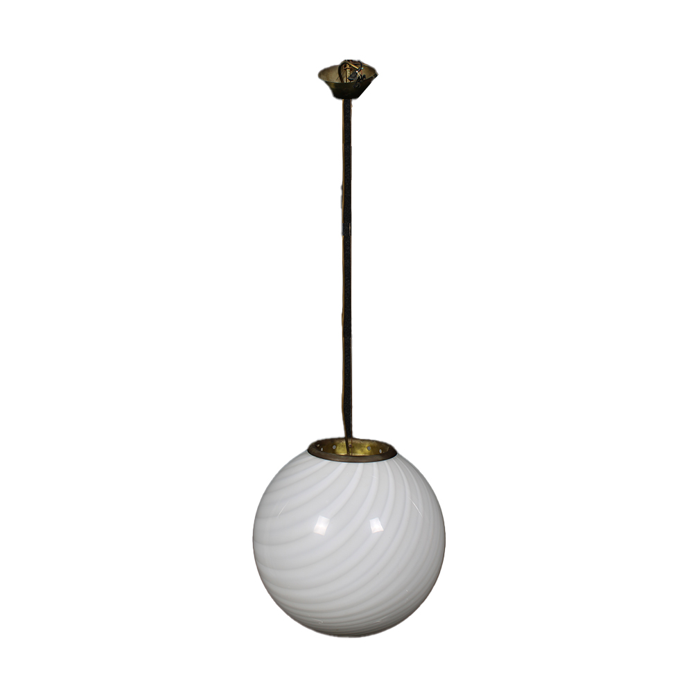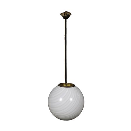 GRANDE SOSPENSIONE in ottone satinato e boccia opaline rigato, produzione italiana periodo stimato anni 70 h cm 122 x Ø 40
