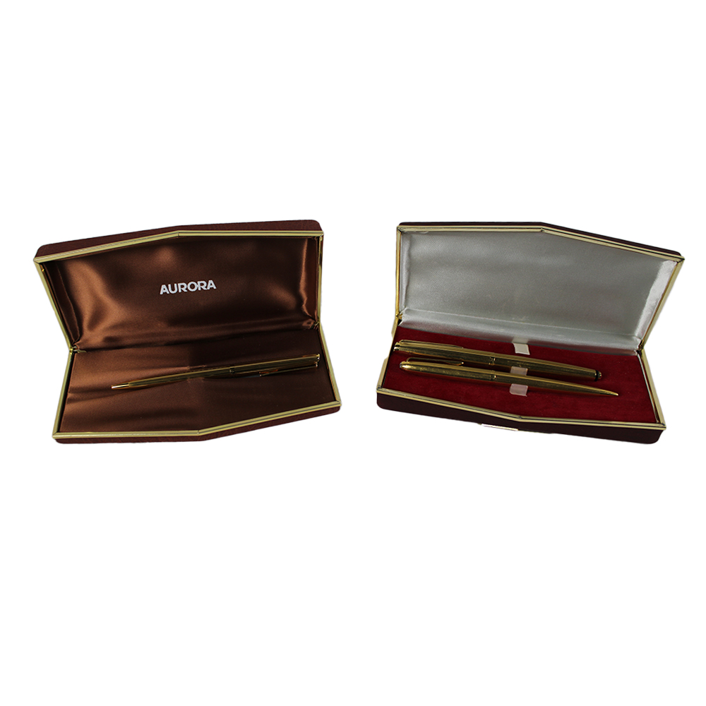 LOTTO COMPOSTO DA 5 penne stilografiche di cui 3 marca Aurora placate in oro ed una marca Latex in argento ed una Parker in metallo argentato. XX secolo misure varie