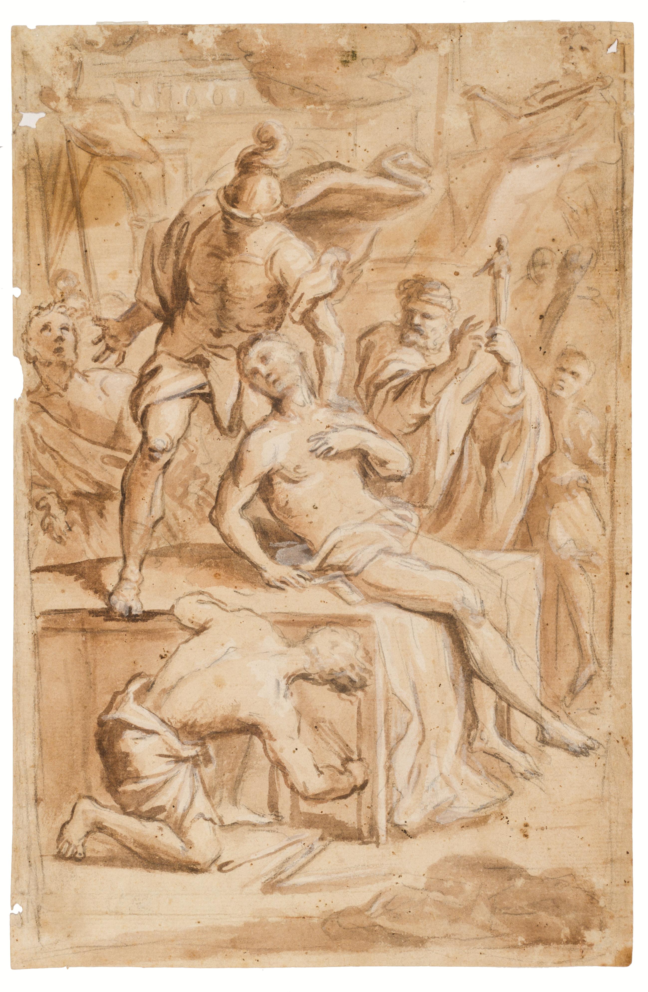 Penna e inchiostro bruno e matita di grafite con rialzi a tempera bianca su carta vergellata. mm 307x203.