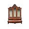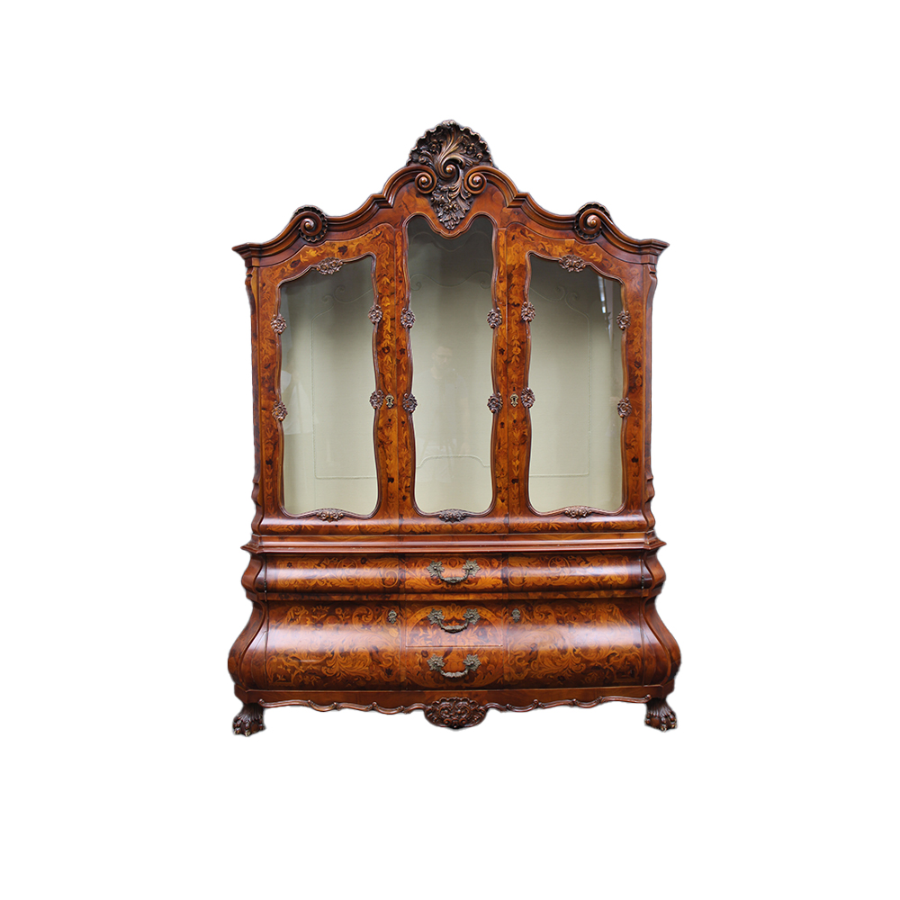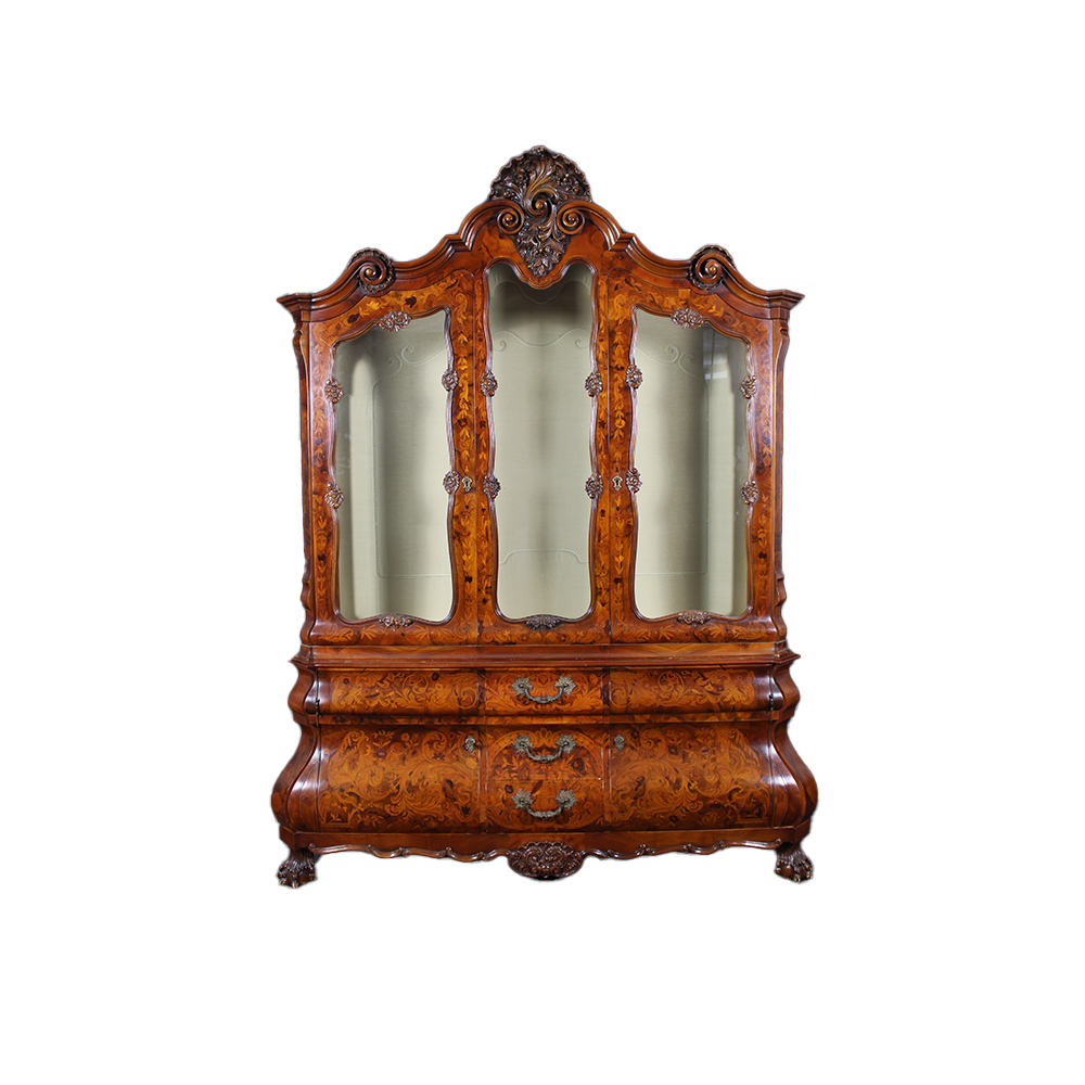 VETRINA DI GUSTO SETTECENTESCO in legno di radica di noce riccamente intarsiata a motivi floreali parte inferiore a 2 ante laterali e 3 cassetti nella parte centrale parte superiore a 2 ante a vetri gambe leonine e serramenti in metallo bronzato maestranze olandesi XX secolo h cm 247 x 188 x 58