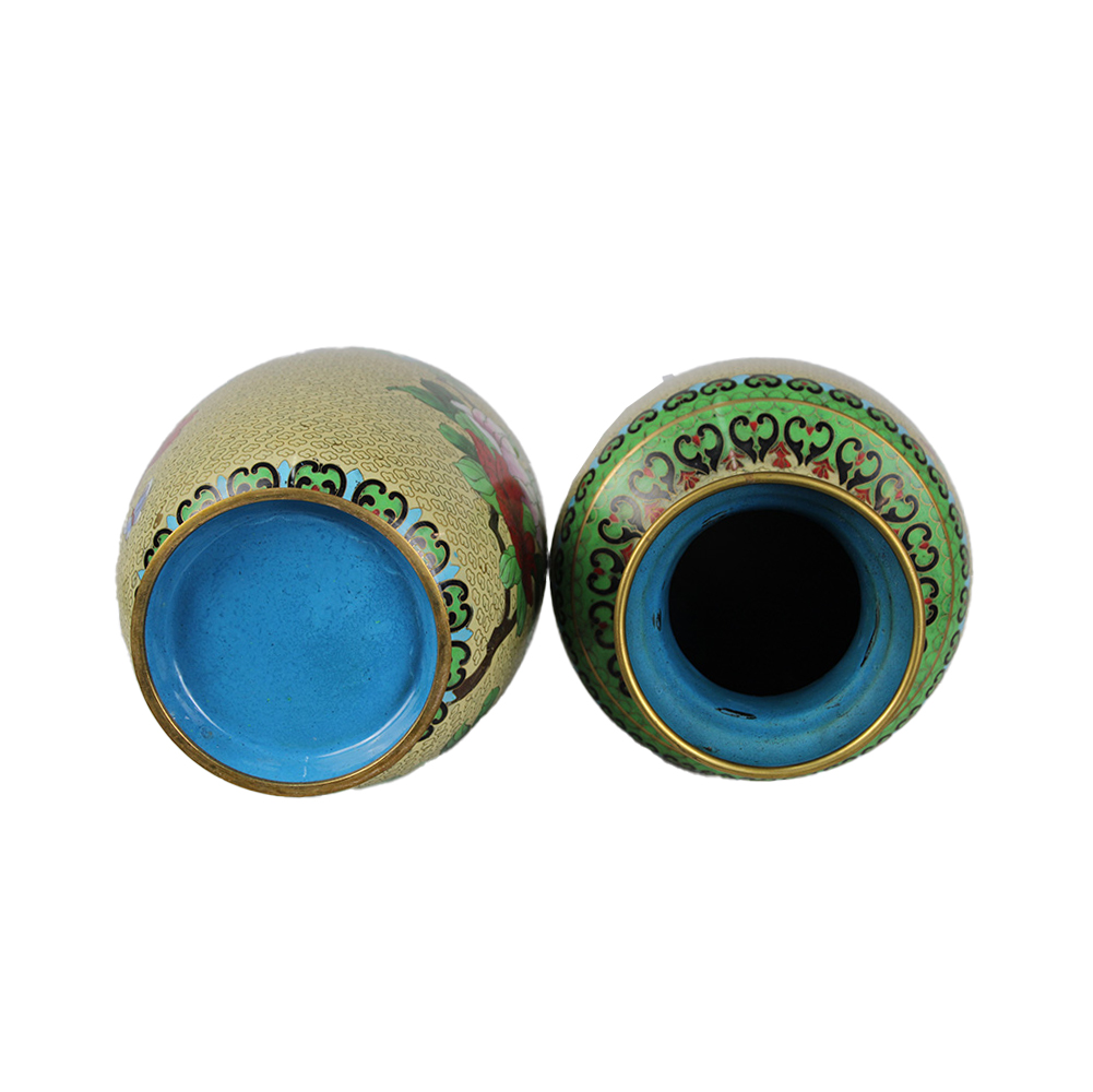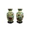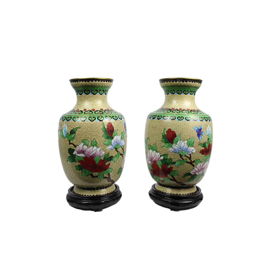 COPPIA DI VASI CLOISONNE decorati a motivi floreali e volativi con basi in legno ebanizzato maestranze orientali XX secolo