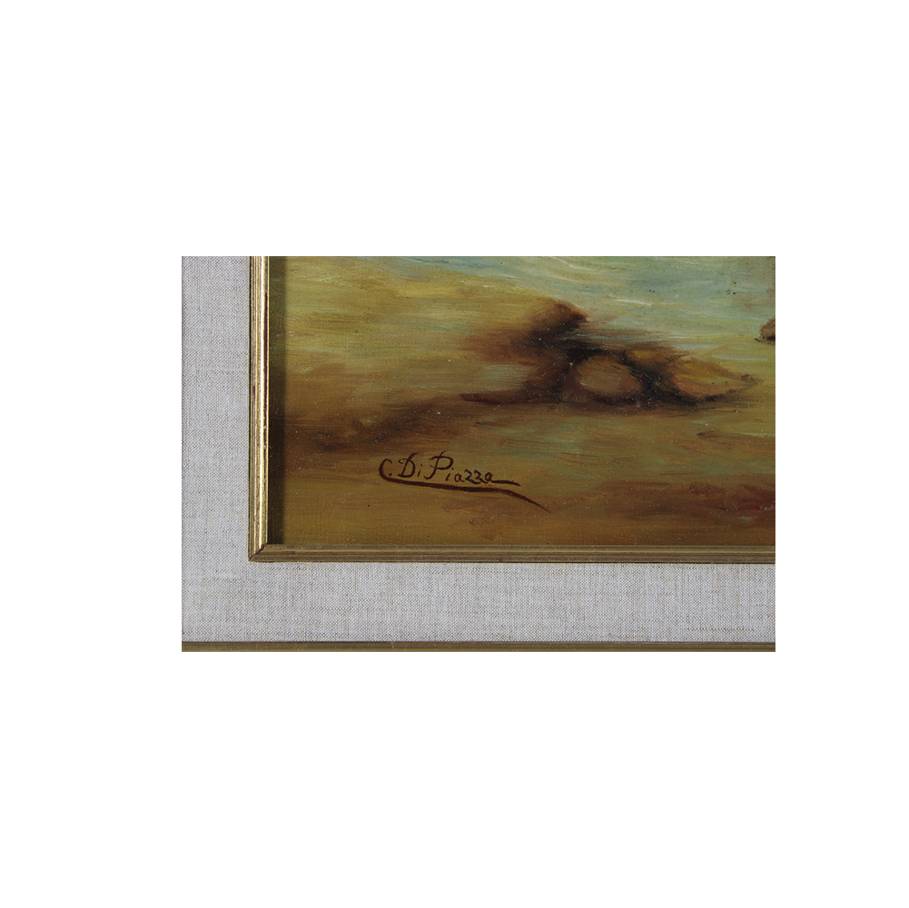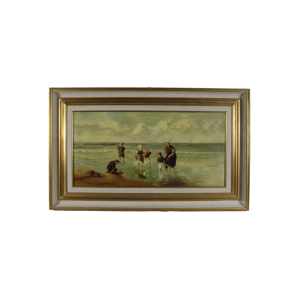 OLIO SU TELA raffigurante marina con personaggi al bagno a firma C. Di Piazza dentro cornice in legno dorato XX secolo h cm 44 x 86 / cornice h cm 70 x 114