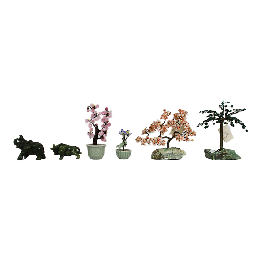 LOTTO COMPOSTO DA 4 alberelli in materiale pregiato e 2 sculture in giada raffiguranti animali maestranze orientali XX secolo misure varie