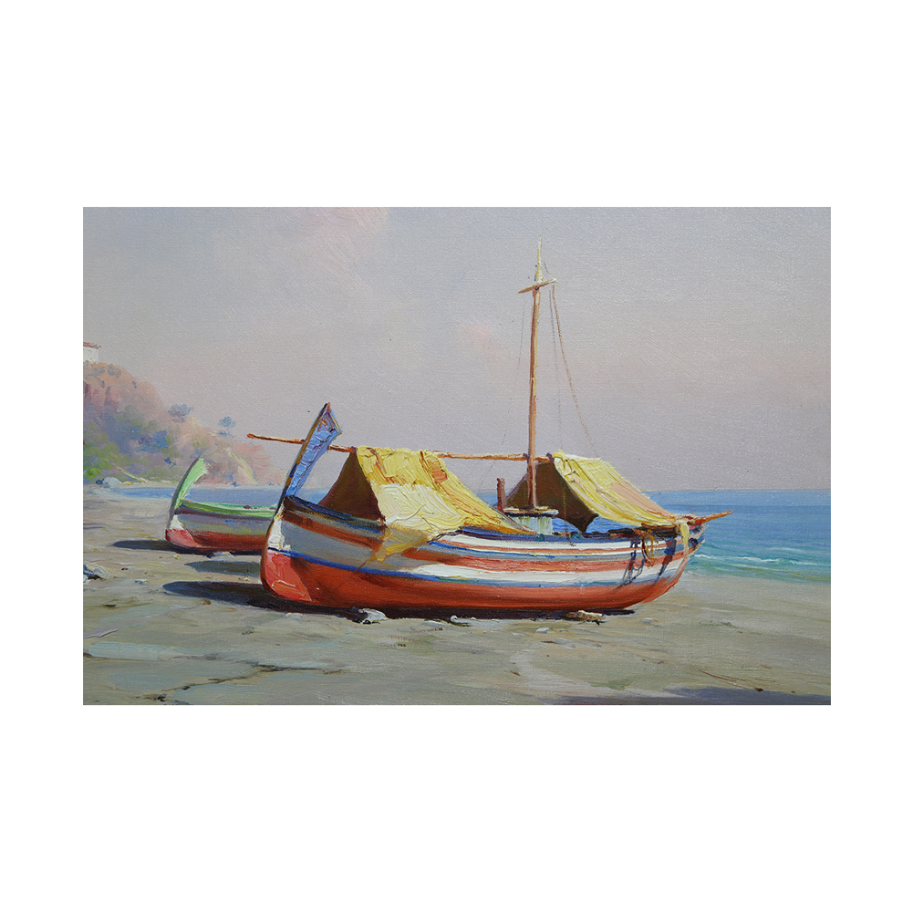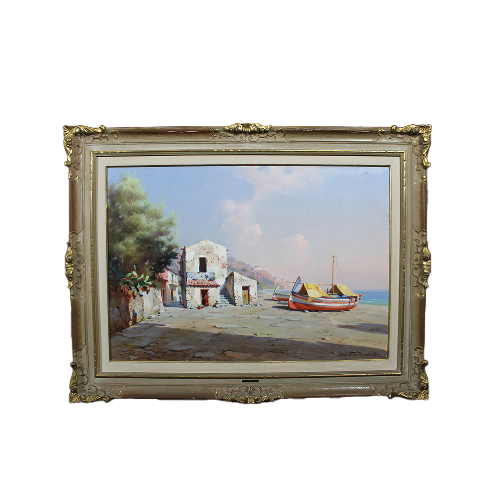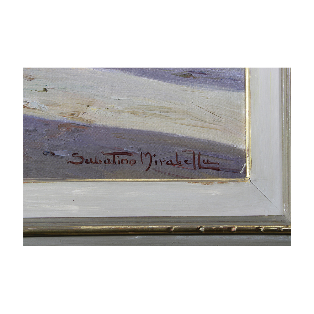 OLIO SU TELA raffigurante borgo marinaro con barche e personaggi firmato Sabatino Mirabella (Palermo 1902-1973) h cm 68 x 98 -cornice h cm 96 x 128