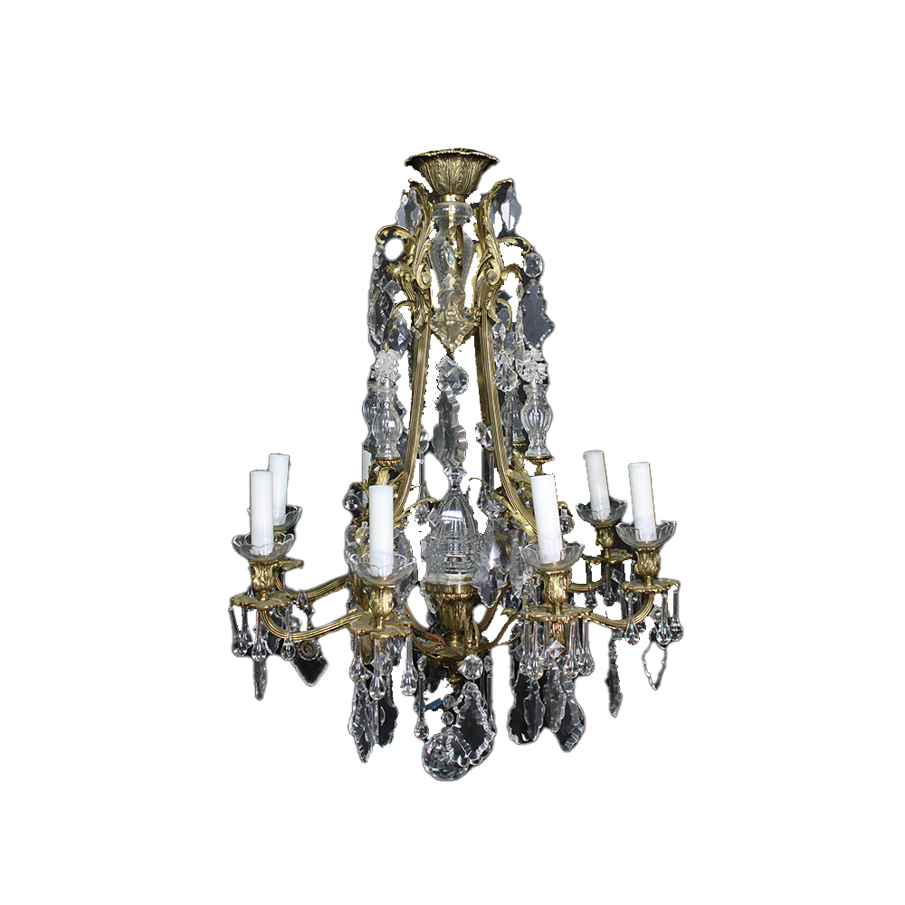LAMPADARIO 9 LUCI in bronzo dorato di gusto settecentesco arricchito da prismi e brindoli in vetro sfaccettato con canne in opaline maestranze italiane primi 900 h cm 100 x 70 x 70