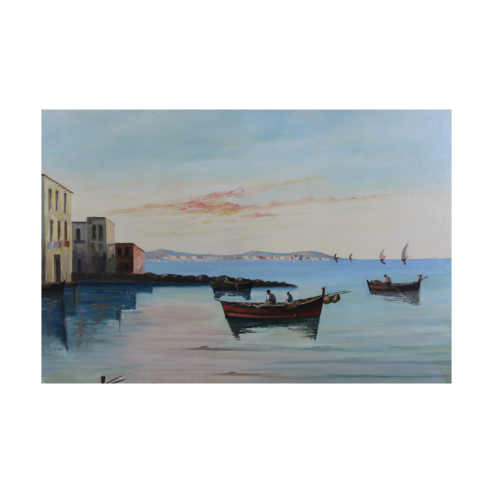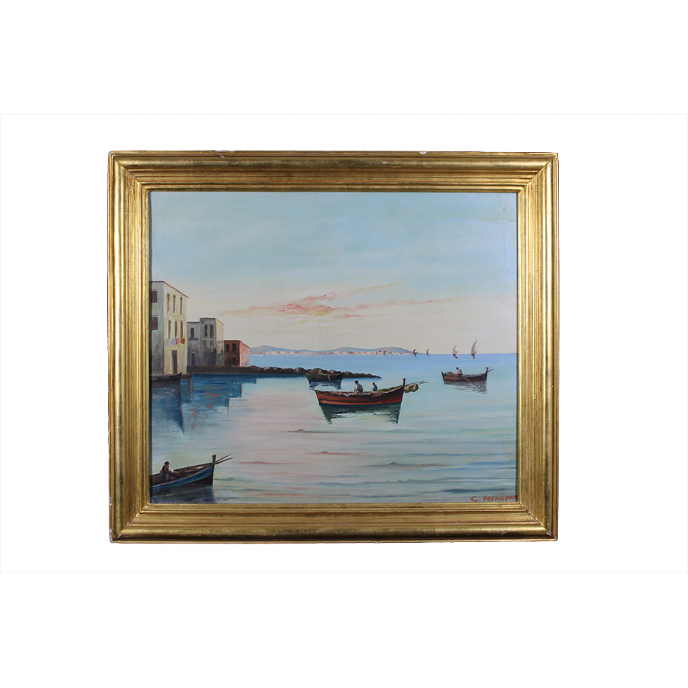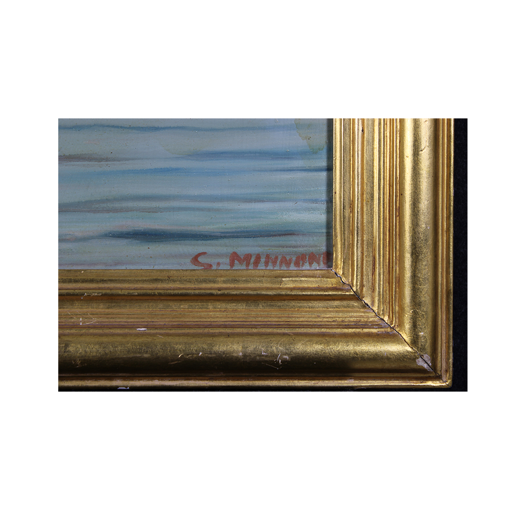 OLIO SU TELA APPLICATO SU COMPENSATO raffigurante marina con barche e pescatori a firma S. Minnone dentro cornice in legno dorato Sicilia XX secolo h cm 74 x 90 - cornice h cm 95 x 110