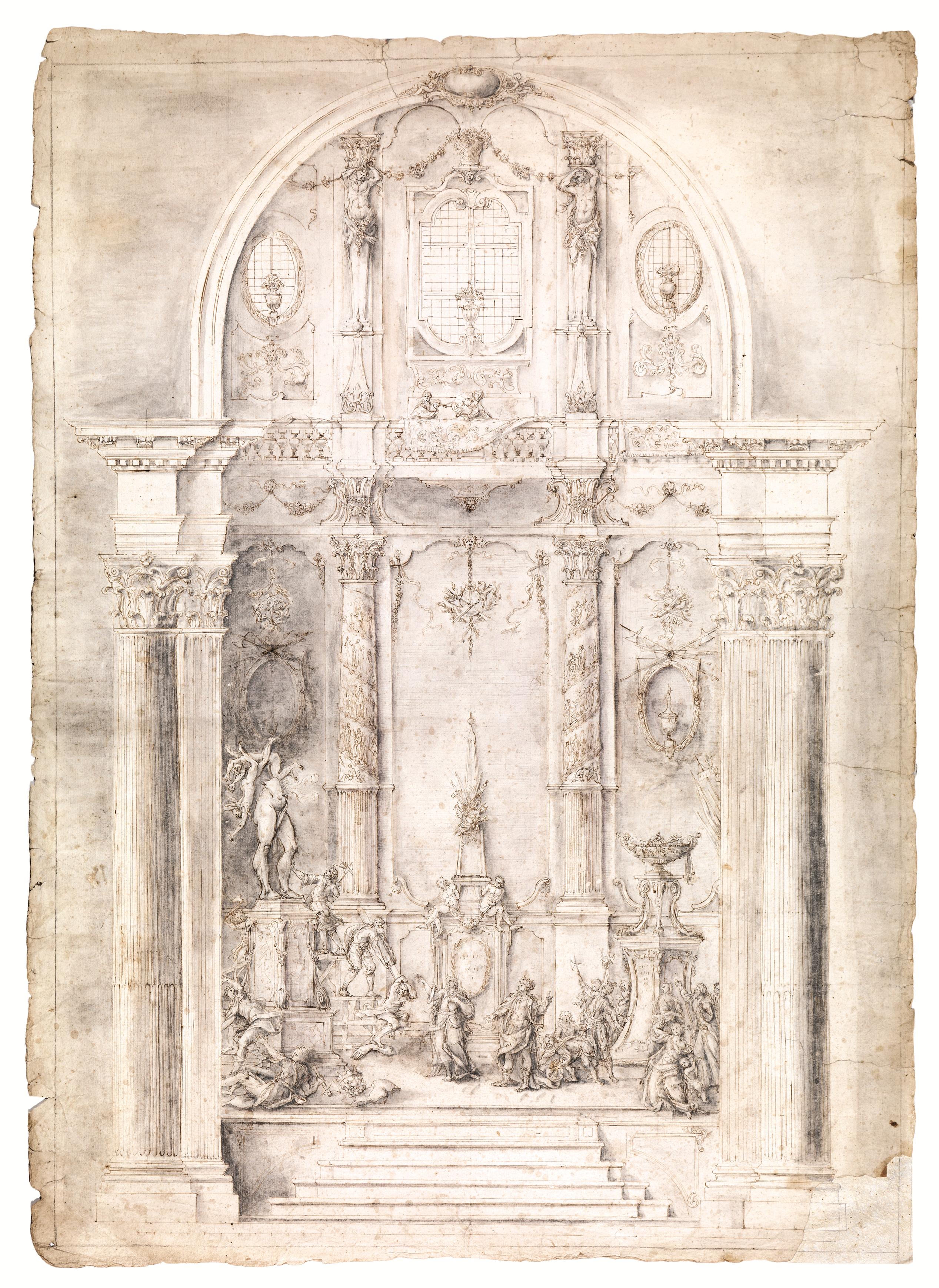 Foglio di grande dimensione. La scena, probabilmente ispirata alla storia di Israele o al Libro dei Re, non è di facile identificazione. La sontuosa architettura barocca, sorretta da colonne corinzie ed arricchita da elaborati fregi e telamoni, ospita la scena concitata di un re che provoca o assiste alla distruzione di una statua, forse un idolo pagano, dalle cui macerie fuoriescono demoni. Il ductus grafico estremamente articolato e finemente dettagliato e l’imponente impianto monumentale, richiamano il trittico di Vittorio Maria Bigari La disputa tra Filippo e Alessandro di Macedonia, Il convito di Baldassarre e Salomone incensa gli idoli oggi alla Pinacoteca Nazionale di Bologna (Casali Pedrielli, 33). E’ possibile tuttavia che l’attribuzione del disegno sia da collocare nella discendenza artistica del Bigari, in particolare nella collaborazione fra Giuseppe Marchesi e Nicola Bertuzzi.