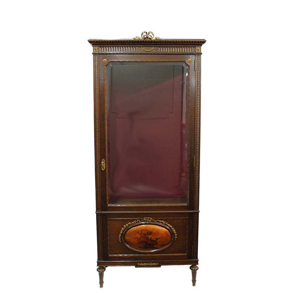 VETRINA DI GUSTO NAPOLEONE III in mogano con lumeggiature in oro ad una anta arricchita da placca a fondo oro dipinta raffigurante putti maestranze italiane primi 900