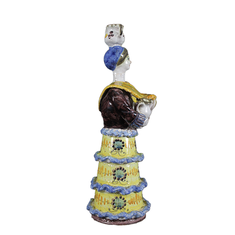 LUCERNA in maiolica policroma raffigurante acquaiola, incollaggi e usure del tempo maestranze siciliane primi 900 h cm 45 x Ø 15,5